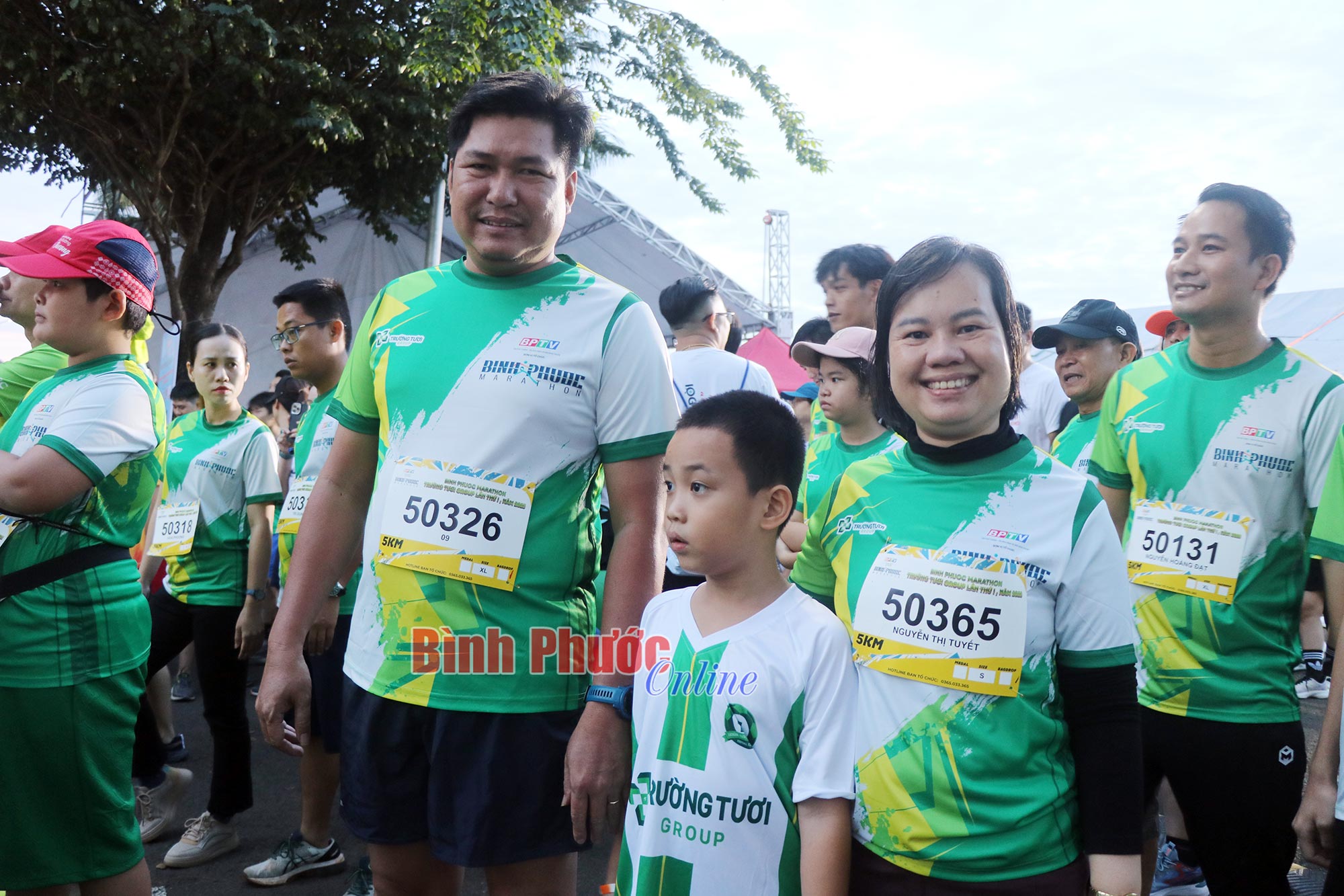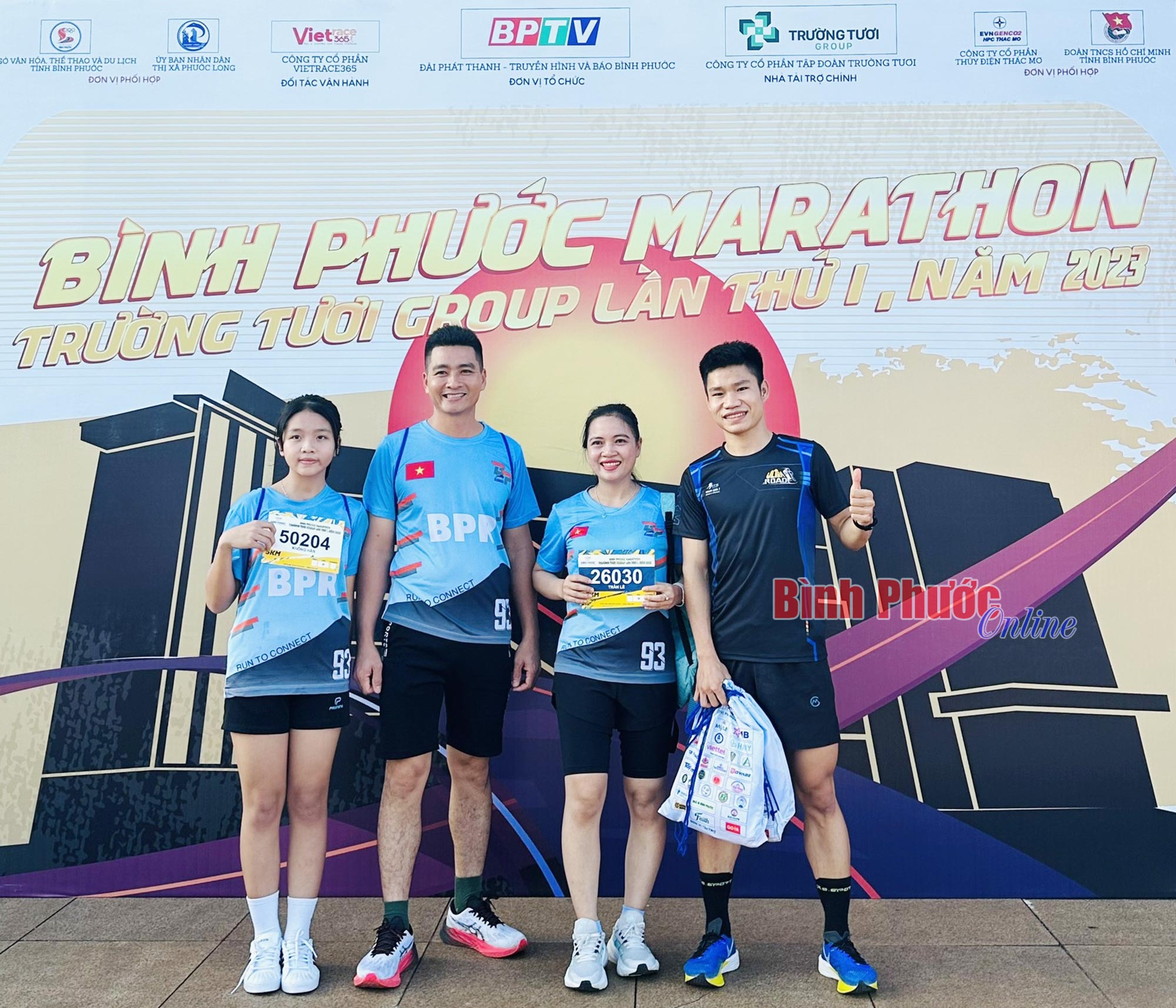 Đến từ thị xã Bến Cát, tỉnh Bình Dương, gia đình anh Nguyễn Quốc Hùng, chị Đào Thị Hường có 4 VĐV tham gia Giải Bình Phước marathon - Trường Tươi Group lần thứ I, năm 2023. Trong đó, chị Hường và con trai thứ hai Nguyễn Quốc Bảo chạy ở cự ly 10km; con trai lớn Nguyễn Mạnh Tân chinh phục cự ly 25km. Đặc biệt, bé út Nguyễn Đào Đan Vy tuy mới 19 tháng tuổi đã đồng hành với ba ở cự ly 5km. Anh Hùng chia sẻ: “Gia đình chạy” là ước mơ từ lâu của cả gia đình, việc cho các con tham gia giải cùng ba mẹ nhằm khuyến khích các con luyện tập thể dục, nâng cao sức khỏe và gắn kết tình cảm giữa các thành viên.