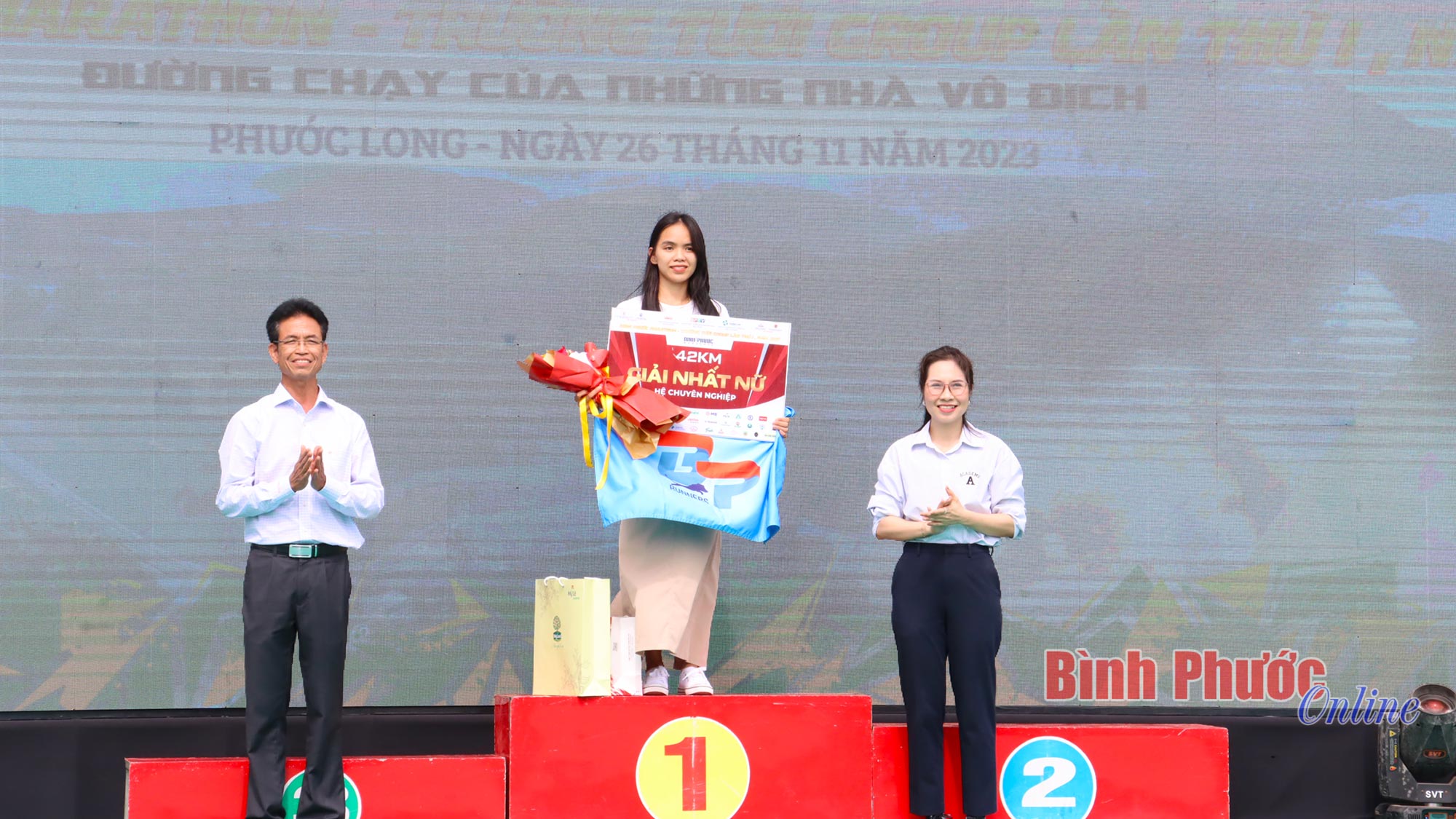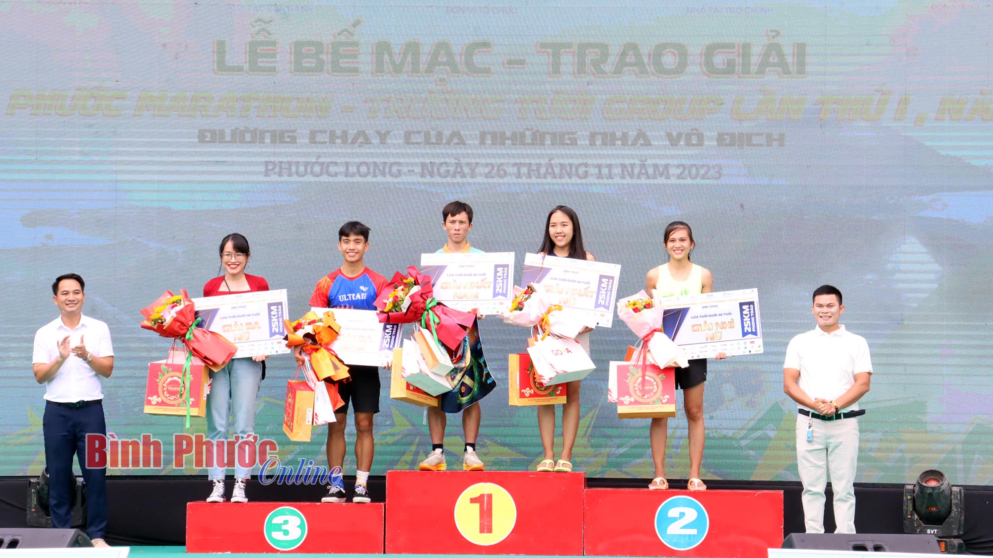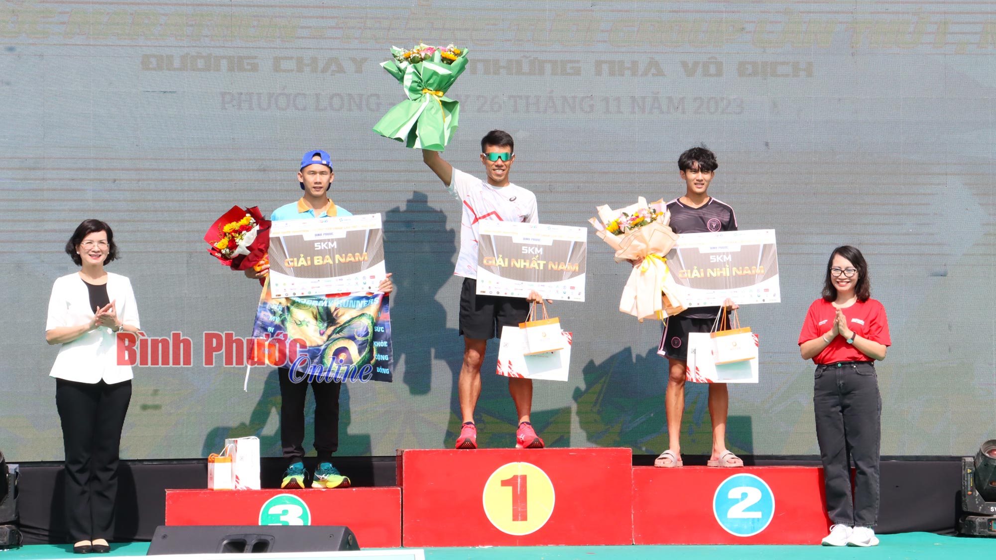 Ủy viên Ban Thường vụ Tỉnh ủy, Phó Chủ tịch UBND tỉnh Bình Phước Trần Tuyết Minh và Tỉnh ủy viên, Giám đốc - Tổng Biên tập BPTV, Trưởng Ban tổ chức giải Nguyễn Thị Minh Nhâm trao giải cho các VĐV đoạt thành tích cao ở cự ly 5km nam