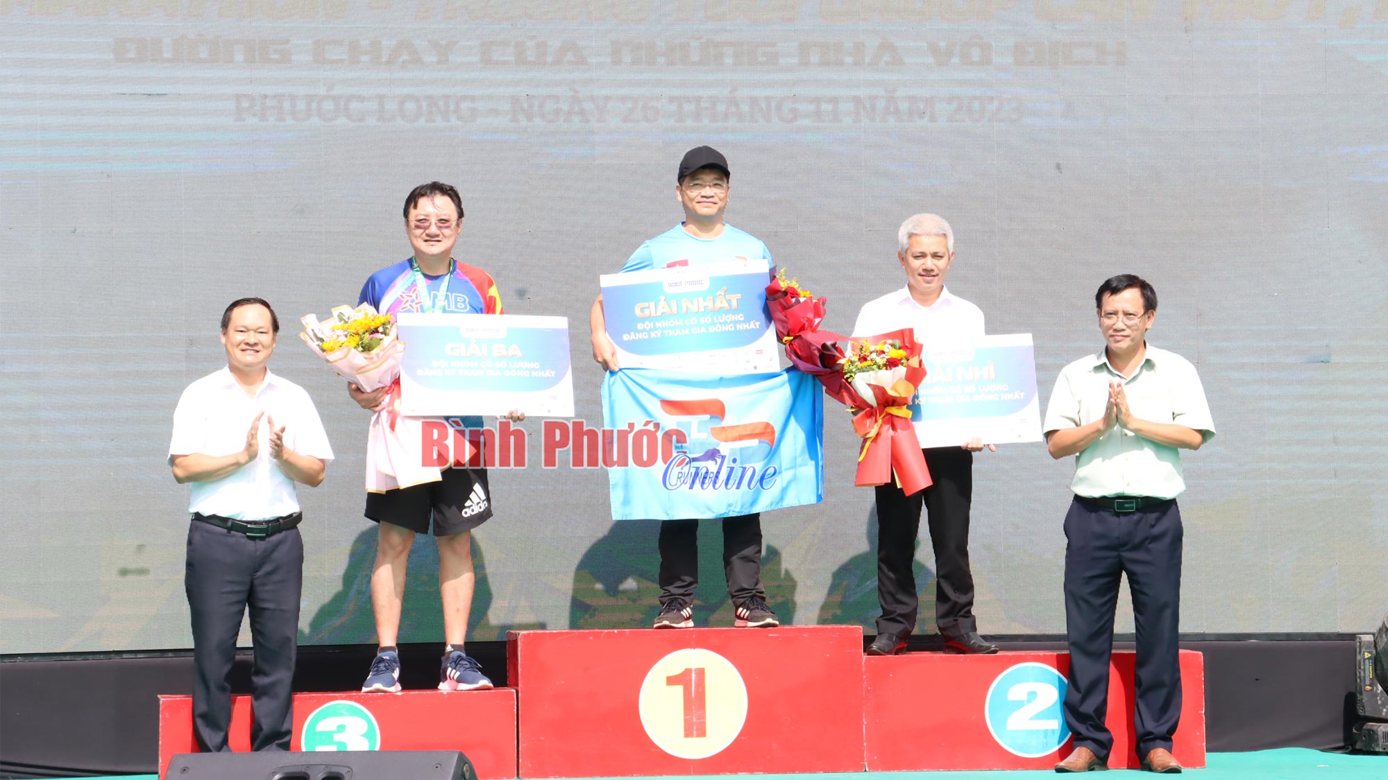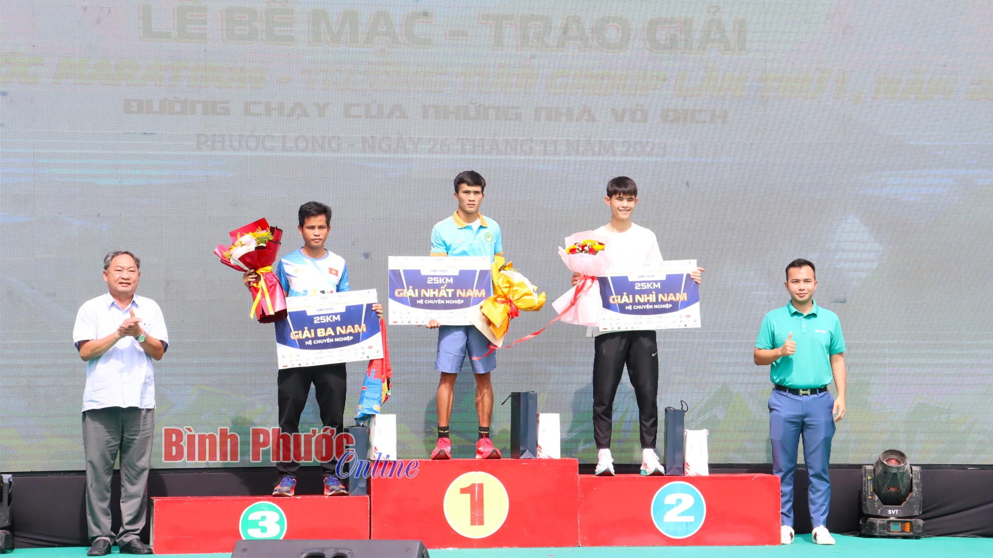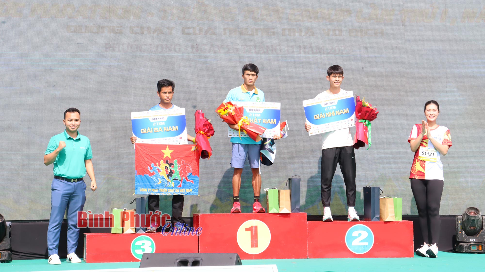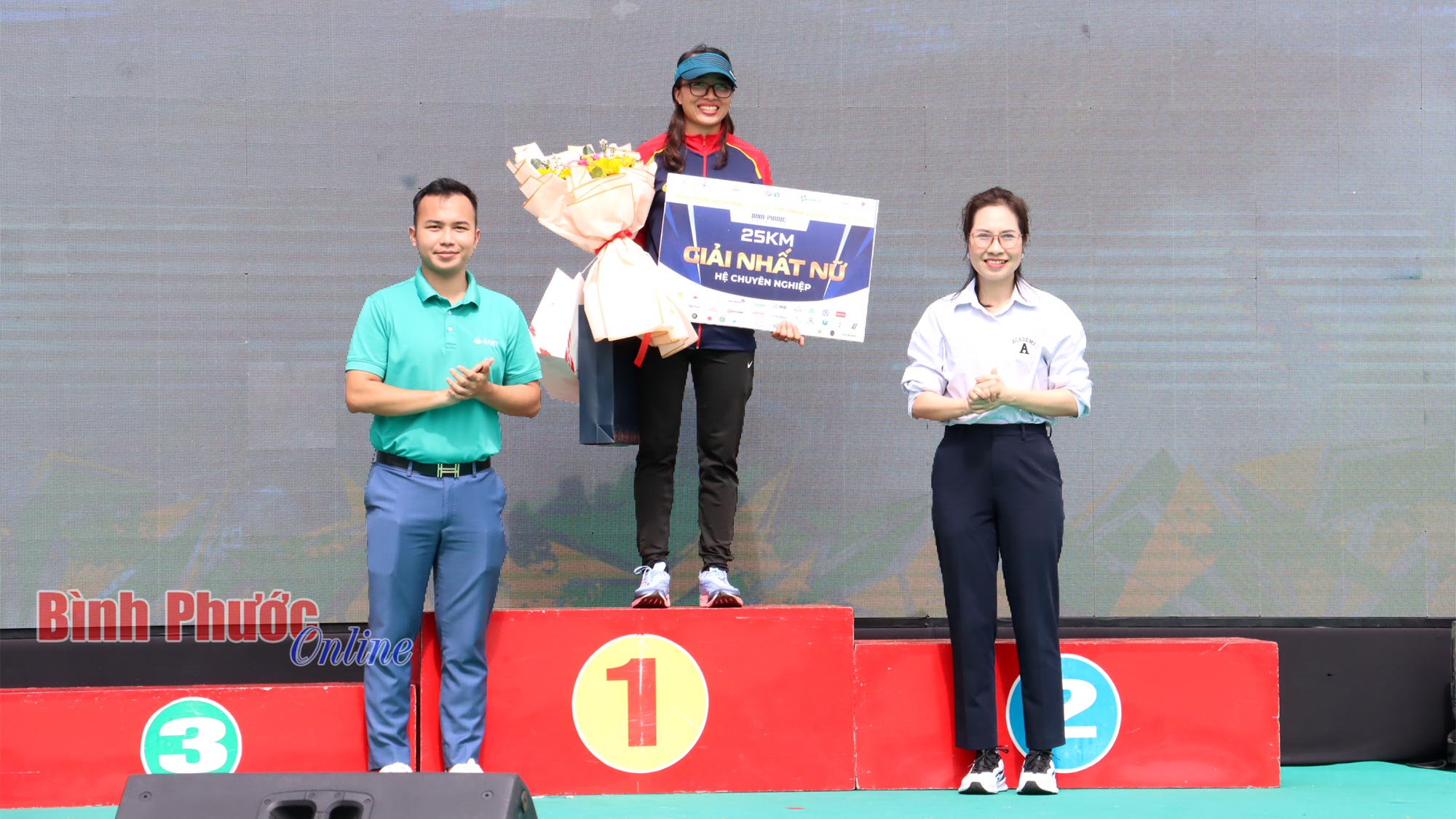 Ủy viên Ban Thường vụ Tỉnh ủy, Phó Chủ tịch UBND tỉnh Bình Phước Trần Tuyết Minh và Tỉnh ủy viên, Giám đốc - Tổng Biên tập BPTV, Trưởng Ban tổ chức giải Nguyễn Thị Minh Nhâm trao giải cho các VĐV đoạt thành tích cao ở cự ly 5km nam