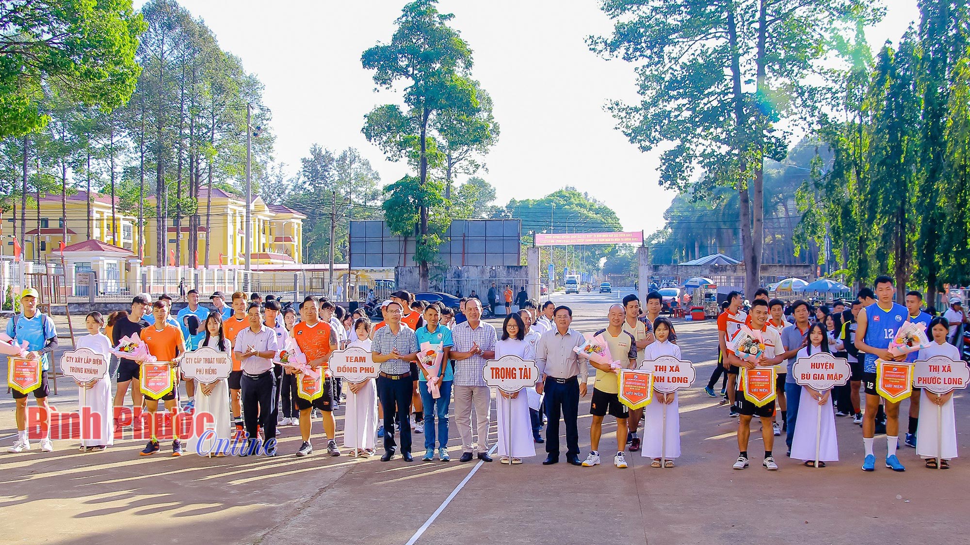 Lãnh đạo thị xã Phước Long trao hoa, cờ lưu niệm cho các đội bóng chuyền về tranh tài và tổ trọng tài