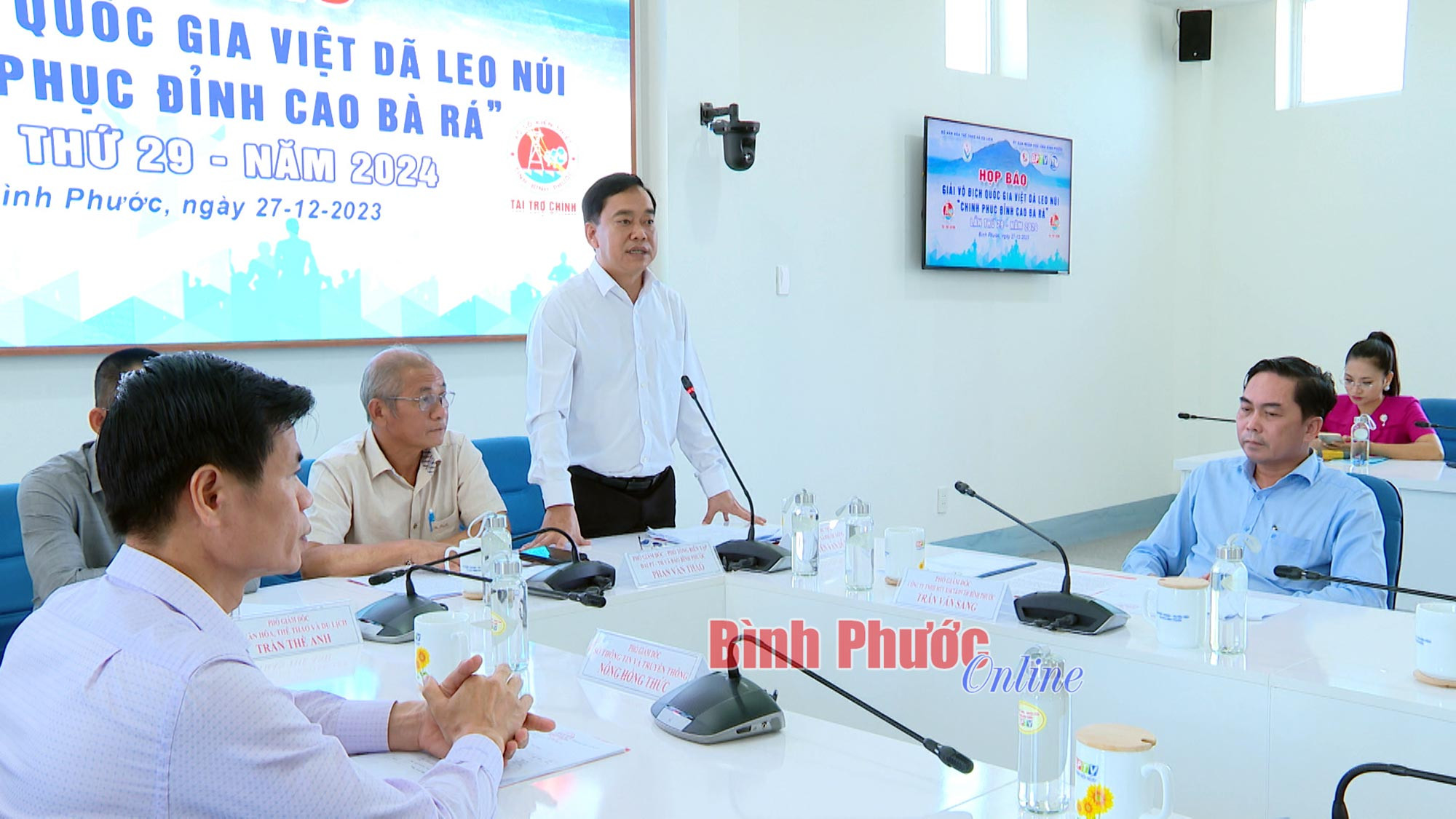 Ông Nguyễn Văn Dũng, Phó Chủ tịch UBND thị xã Phước Long thông tin về công tác phối hợp tổ chức và đón tiếp vận động viên tham gia giải tại buổi họp báo về giải - Ảnh: Trần Thể