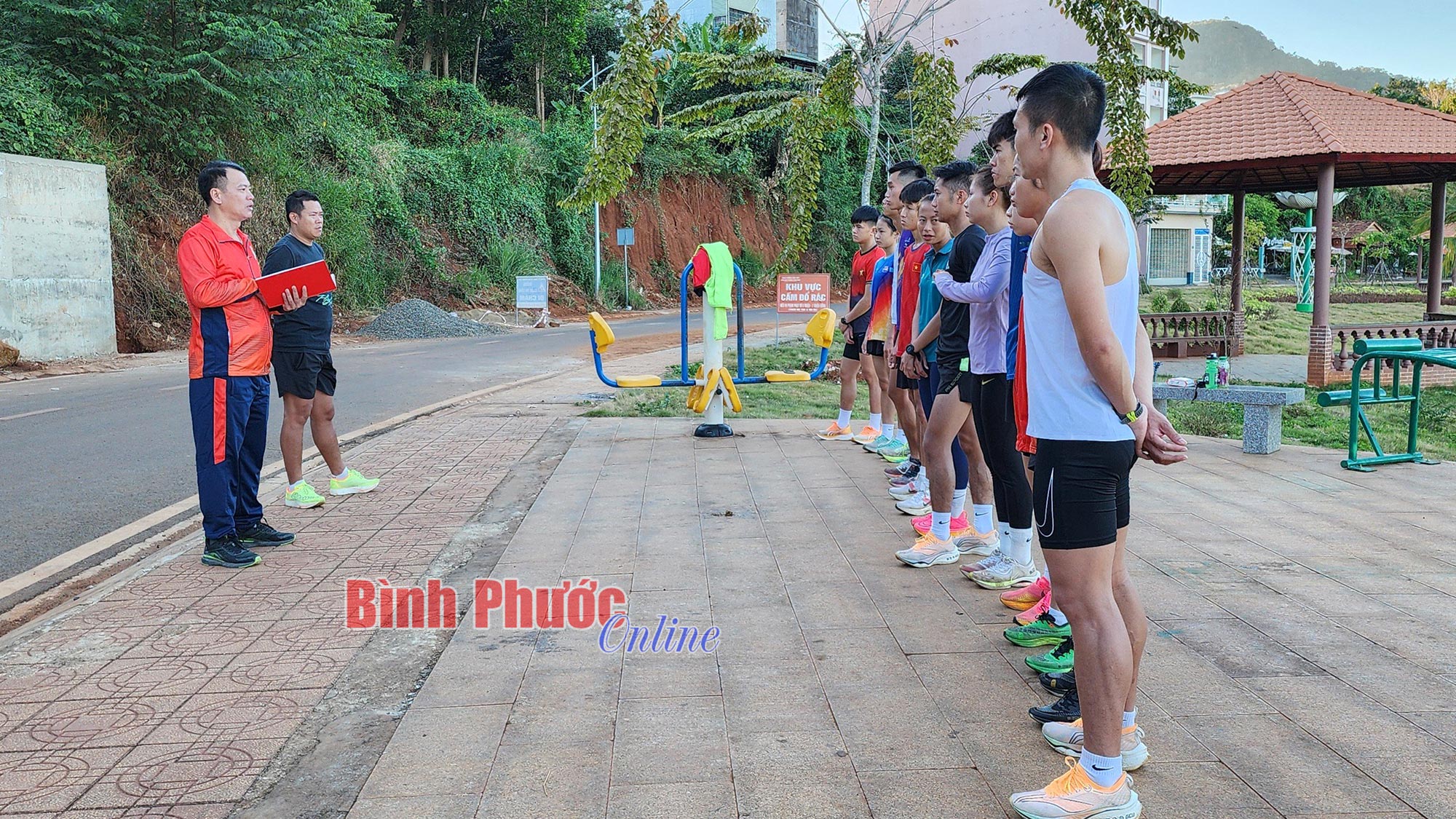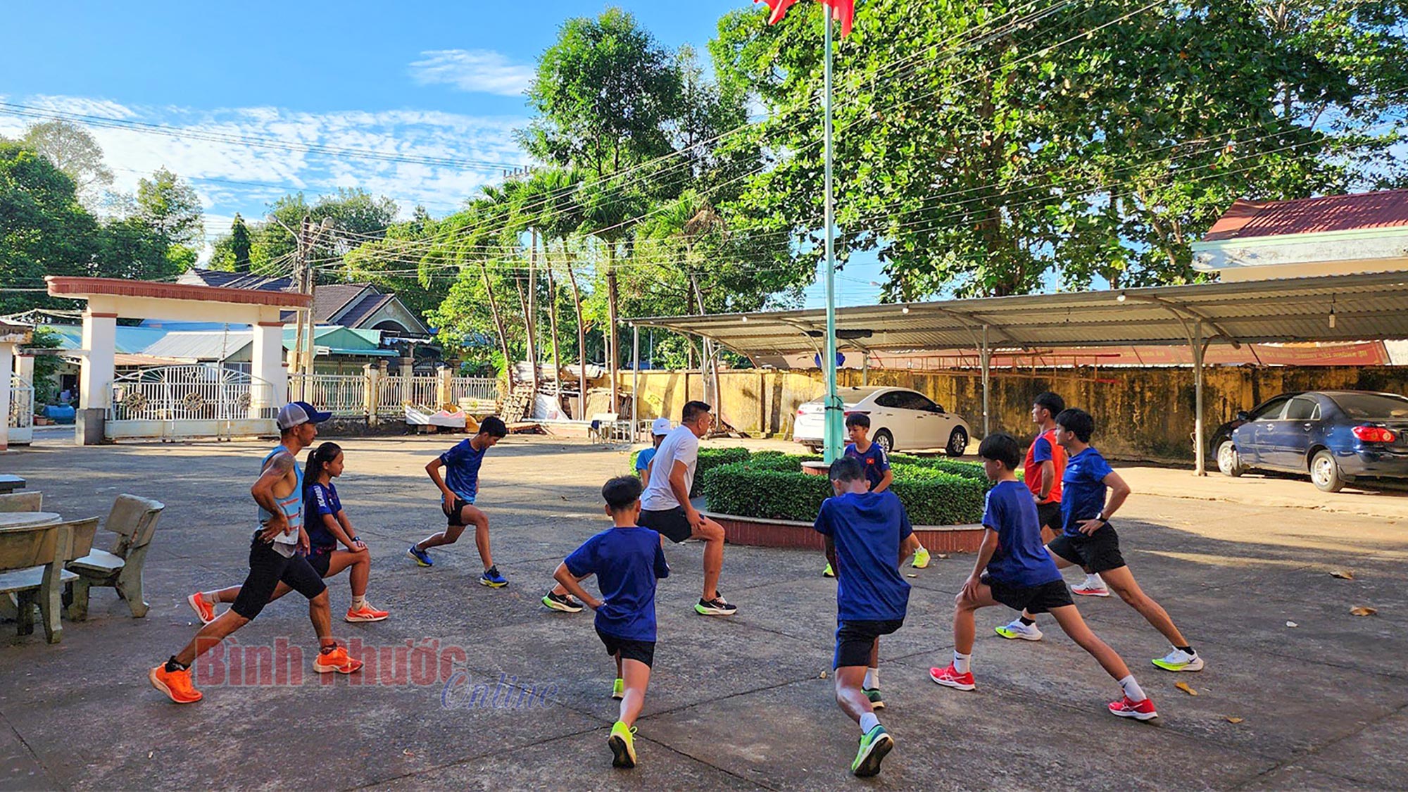 Huấn luyện viên tuyển điền kinh Bình Phước Trần Đoàn Minh Thiện cùng các học trò luyện tập chuẩn bị cho giải