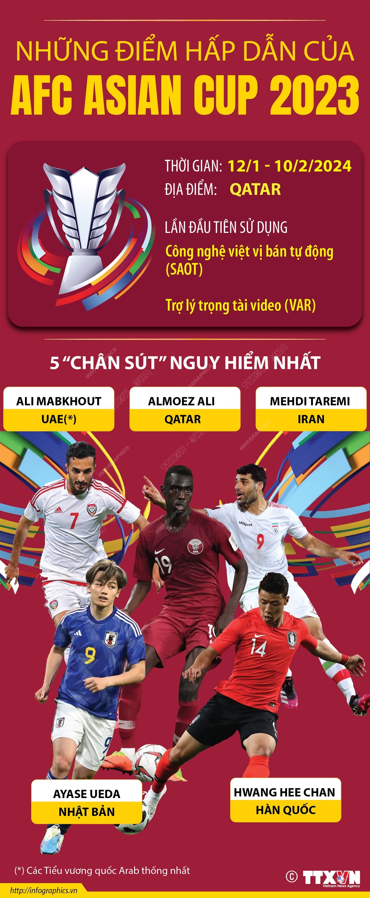 Giải đấu vô địch bóng đá châu Á AFC Asian Cup 2023 diễn ra từ 12-1 đến 10-2-2024 tại Qatar, có nhiều điểm hấp dẫn, hứa hẹn mang tới cho các cầu thủ, những người trực tiếp tham gia và điều hành giải đấu cũng như đông đảo khán giả những trải nghiệm thú vị trong ngày hội bóng đá toàn châu lục này.