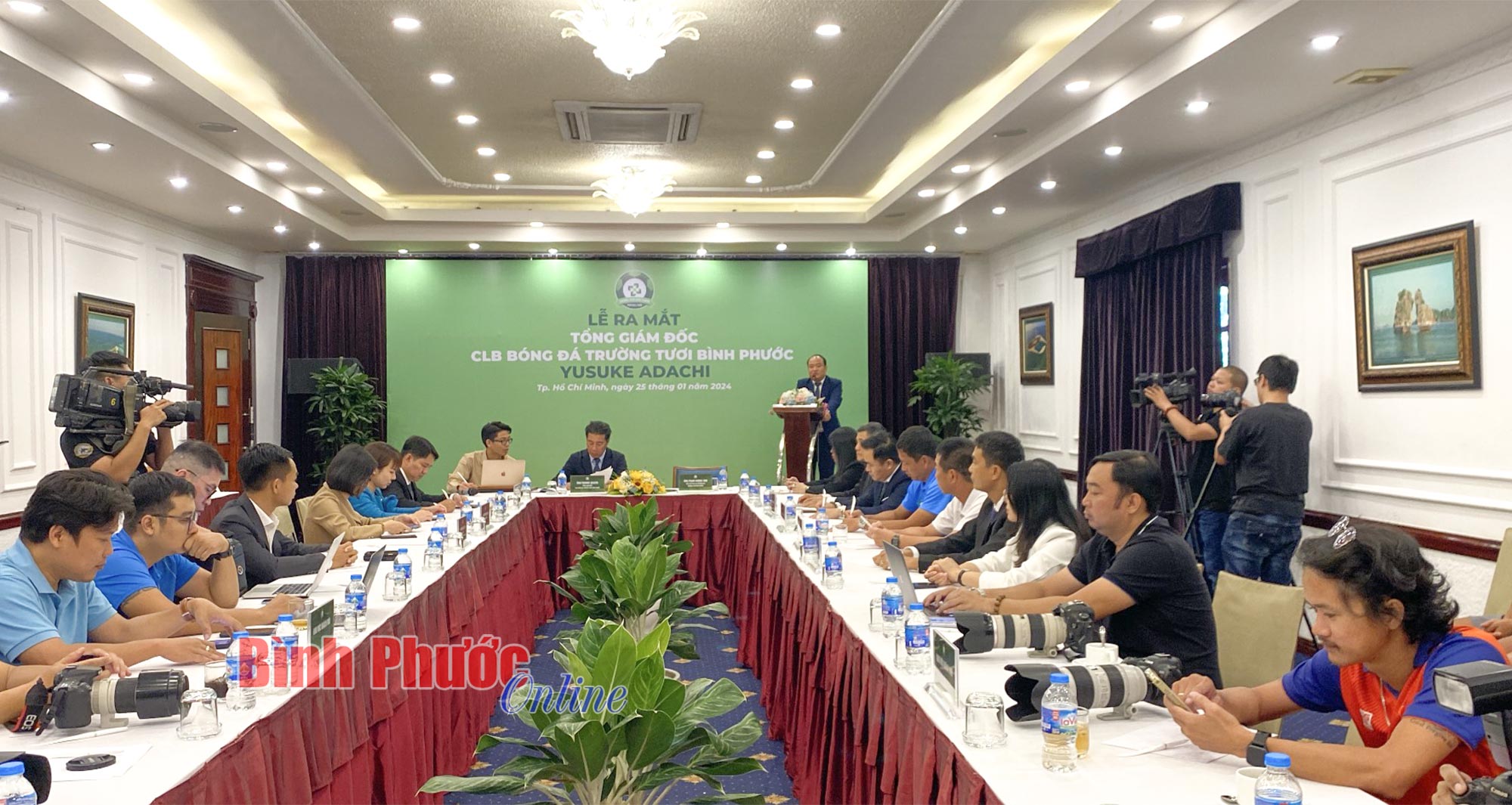 Quang cảnh buổi ký kết, công bố bản hợp đồng dài hạn giữa CLB Trường Tươi Bình Phước với Tổng Giám đốc điều hành Adachi