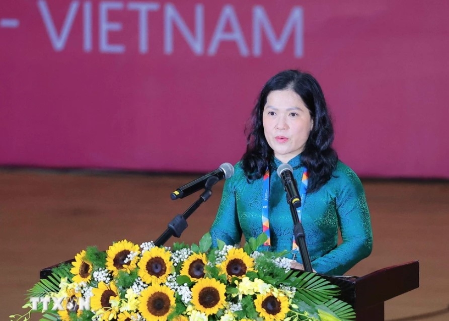 Thứ trưởng Bộ Giáo dục và Đào tạo Nguyễn Thị Kim Chi, Trưởng ban Tổ chức Đại hội phát biểu bế mạc. (Ảnh: Trần Lê Lâm/TTXVN)