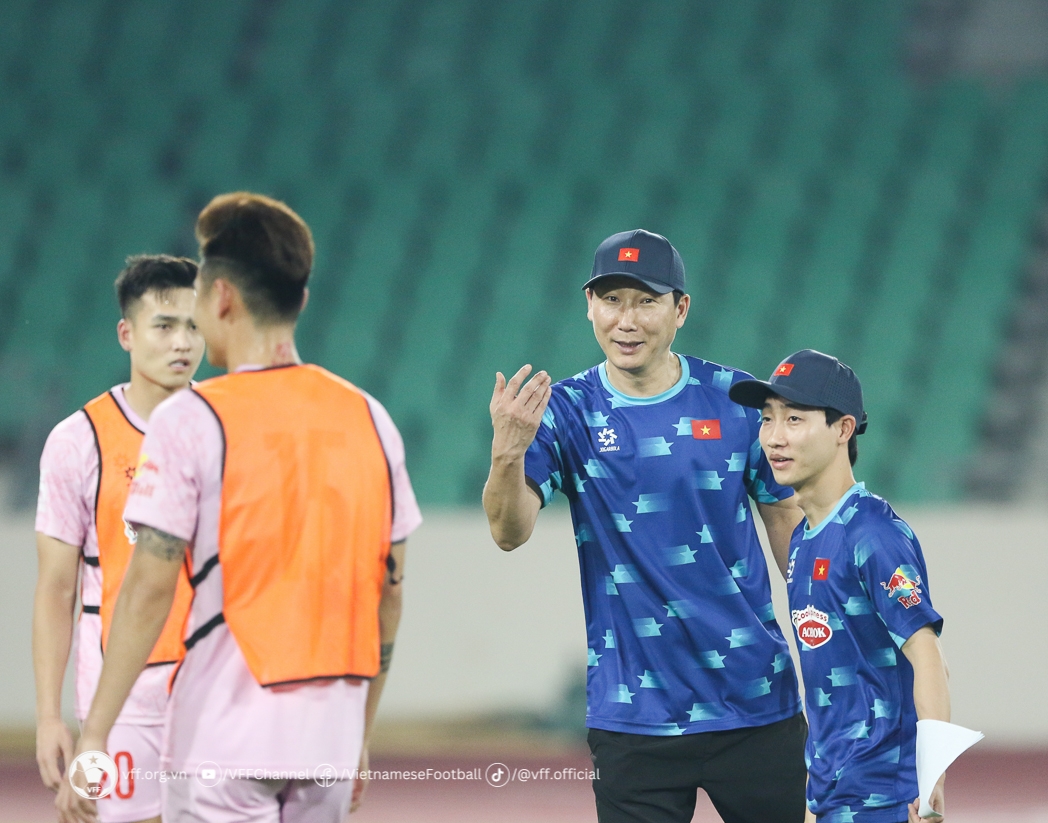 HLV trưởng Kim Sang Sik và các cộng sự tiếp tục tập trung vào nội dung rèn đấu pháp và xây dựng các phương án tấn công, phòng ngự chuẩn bị cho trận đấu với Iraq. Ảnh: VFF