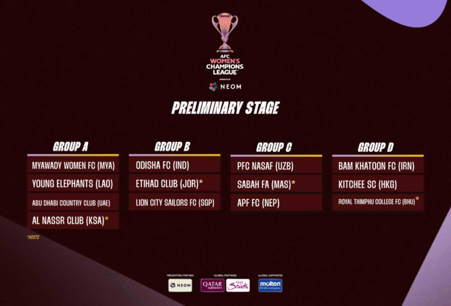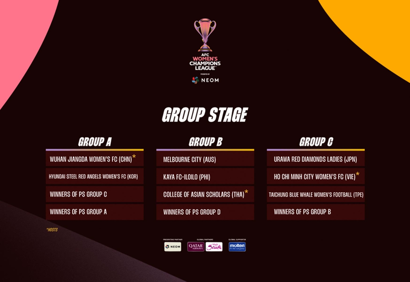 Giải đấu sẽ diễn ra từ tháng 8-2024 đến tháng 3-2025. Các đội bóng được chia thành hai nhóm: 12 đội xếp hạng cao nhất theo bảng xếp hạng bóng đá nữ FIFA tính đến ngày 15-3-2024 sẽ vào thẳng vòng bảng (trong đó có CLB bóng đá nữ TP. Hồ Chí Minh) và 10 đội còn lại thi đấu vòng sơ loại để chọn ra 4 đội bổ sung.
