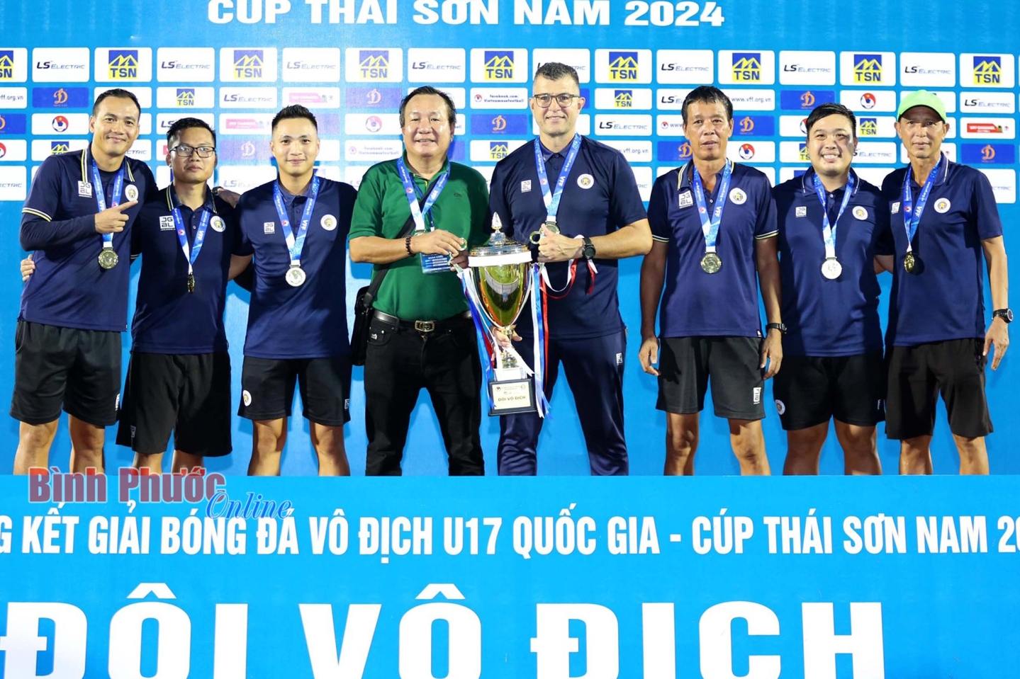 HLV Cristiano Roland cùng ban huấn luyện vui mừng với cúp vô địch