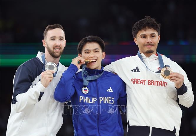 VĐV Carlos Edriel Yulo (giữa) của Philippines giành HCV nội dung biểu diễn trên sàn môn thể dục dụng cụ tại Olympic Paris 2024. Ảnh: THX/TTXVNĐộ khó của bài thi, kết hợp với màn trình diễn xuất sắc của Yulo, đã đảm bảo cho VĐV này vị trí cao nhất trên bục vinh quang. Chiến thắng này đánh dấu cột mốc lịch sử trong sự nghiệp của Yulo, củng cố vị thế của anh là một trong những vận động viên thể dục dụng cụ hàng đầu thế giới", tờ One Sports viết.