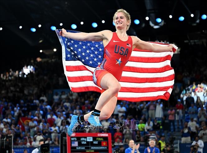 VĐV Amit Elor của Mỹ giành HCV nội dung đấu vật hạng 68kg tự do nữ tại Olympic Paris 2024 ngày 6-8-2024. Ảnh: THX/TTXVNĐoàn Trung Quốc bám sát ở vị trí thứ 2 với 25 HCV, 23 HCB và 17 HCĐ. Trong khi đó, đoàn Australia tiếp tục giữ vị trí thứ 3 với 18 HCV, 16 HCB và 20 HCĐ.