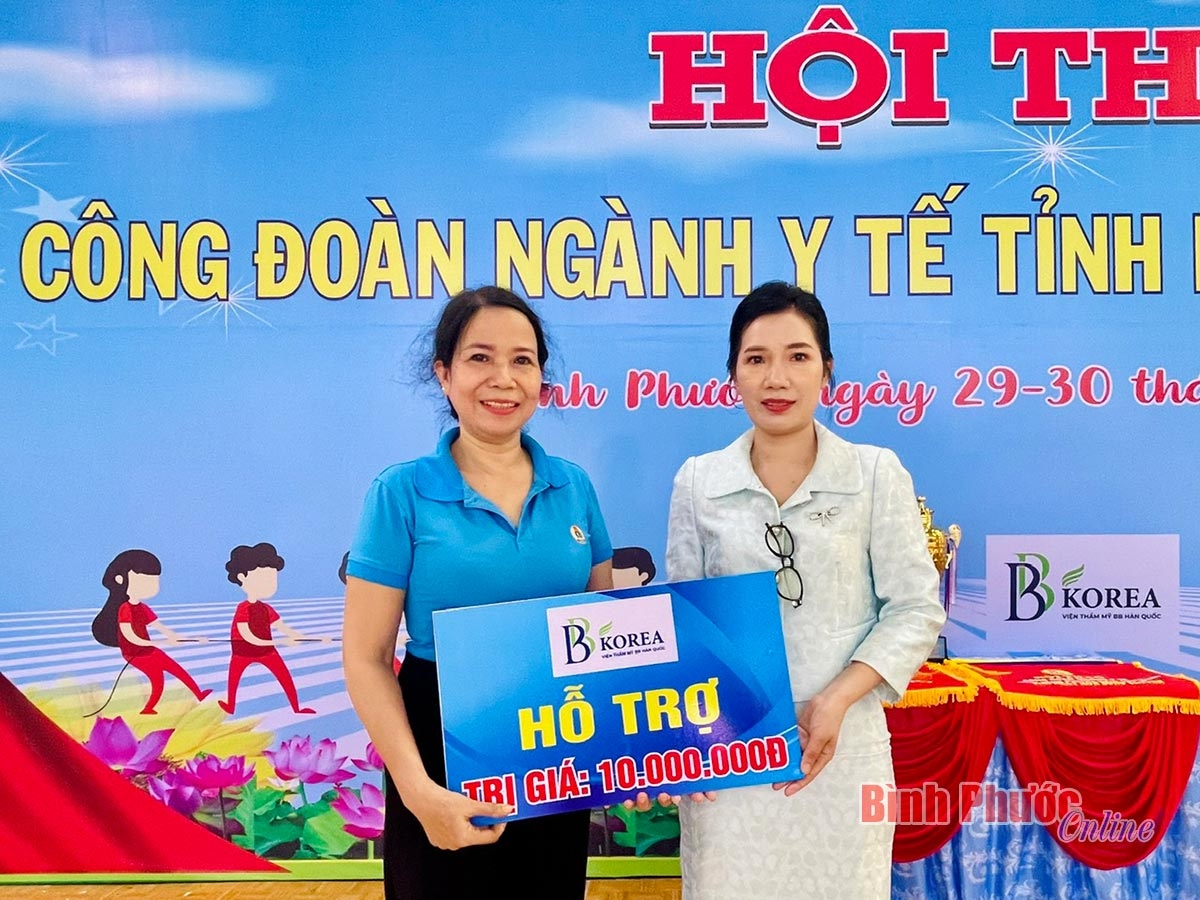 Bà Trịnh Thu Tươi, Phó Chủ tịch phụ trách Công đoàn ngành y tế tỉnh Bình Phước nhận tài trợ kinh phí tổ chức hội thao từ bà Nguyễn Thị Diễm Phương, Giám đốc chi nhánh BB KOREA Đồng Xoài
