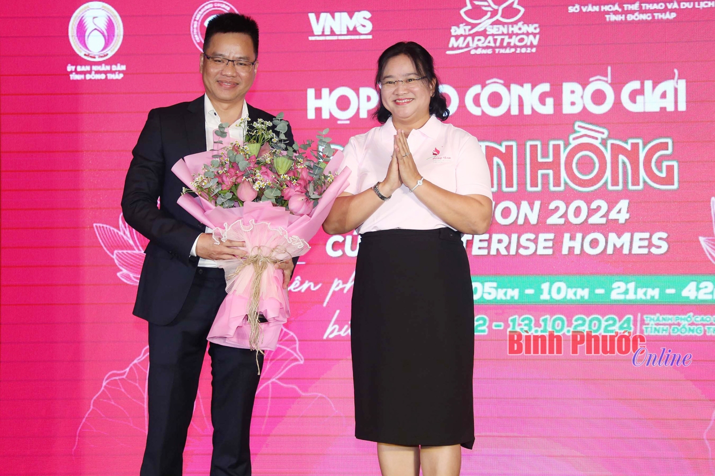 Bà Huỳnh Thị Hoài Thu, Giám đốc Sở VH-TT&DL tỉnh Đồng Tháp trao hoa cho ông Võ Trí Anh, đại diện nhà tài trợ Masterise
