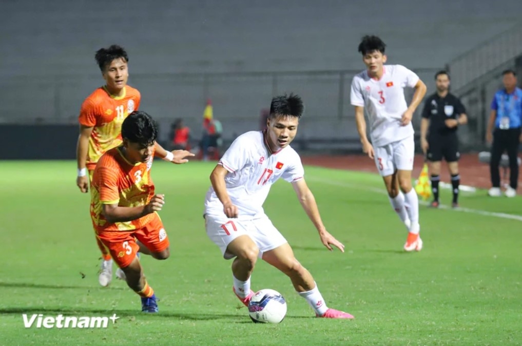 Đội tuyển U20 Việt Nam (áo trắng) có thắng lợi thứ hai liên tiếp ở bảng A Vòng loại U20 châu Á 2025. (Ảnh: Việt Anh/Vietnam+)