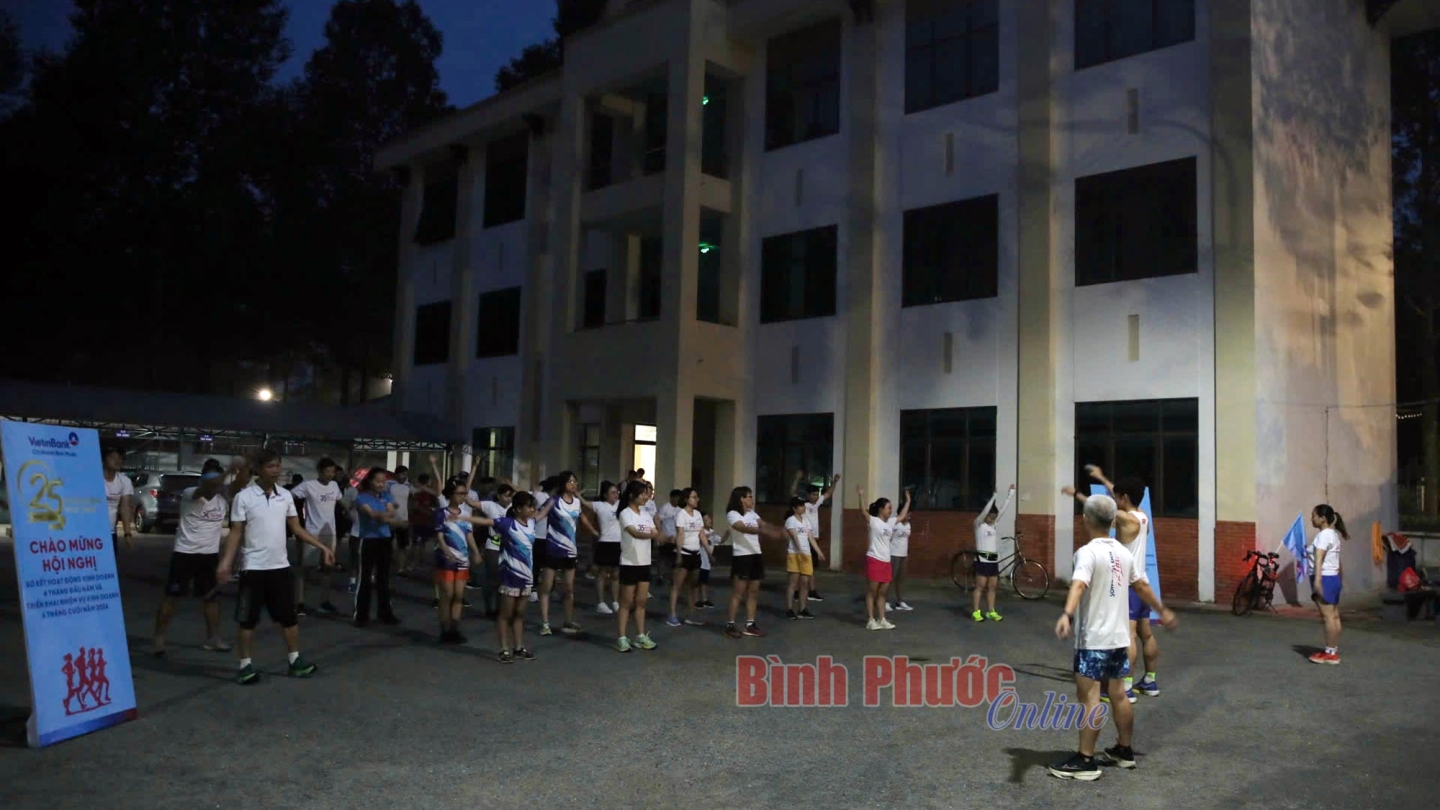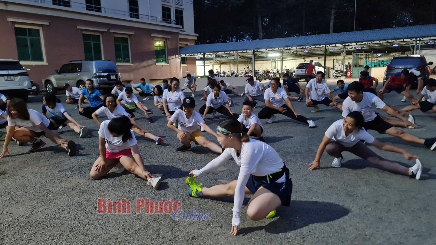 Các thành viên Câu lạc bộ VietinBank Bình Phước Runners khởi động chuẩn bị cho một buổi chạy