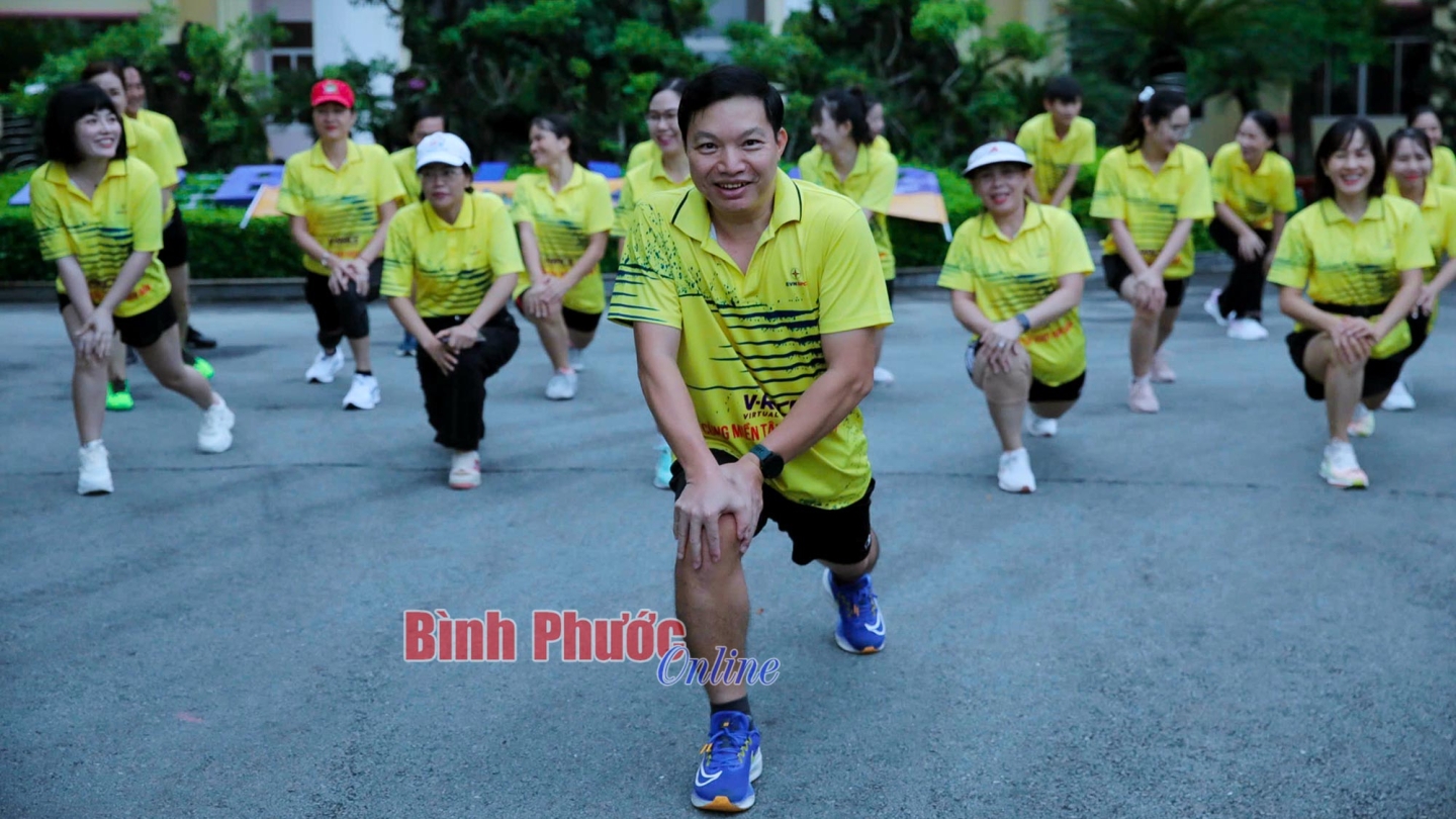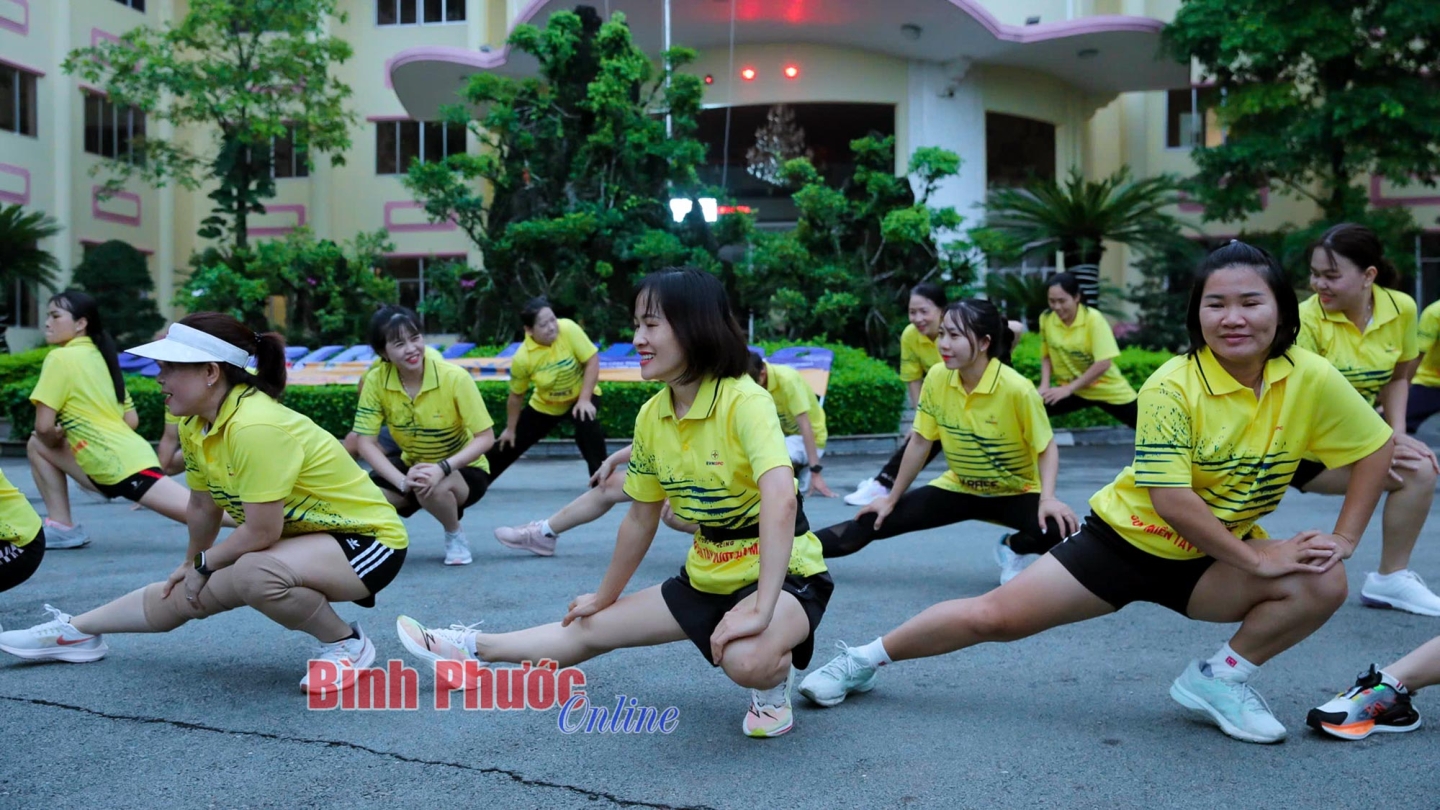 Cán bộ, nhân viên Công ty Điện lực Bình Phước cùng nhau khởi động, chuẩn bị cho một buổi chạy - Ảnh: Trương Hiện
