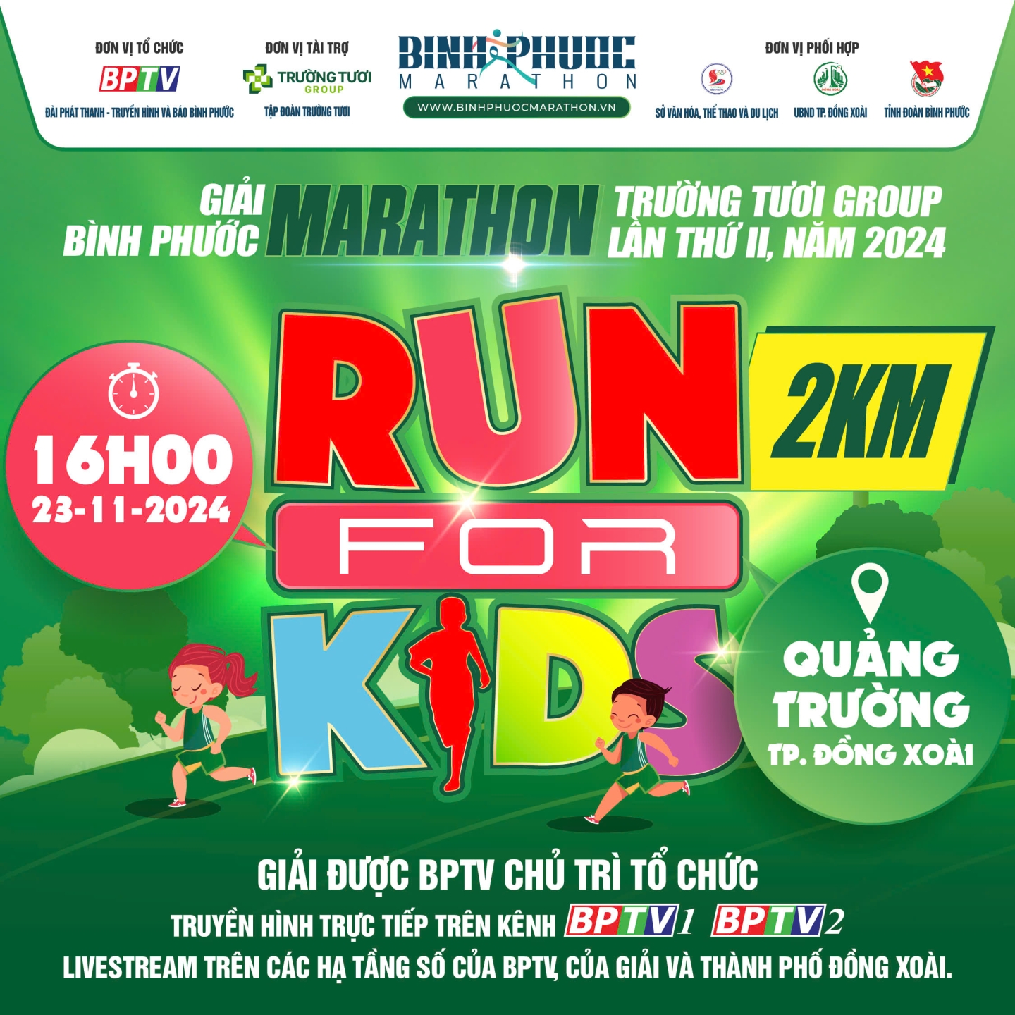 RUN FOR KIDS - Giải Bình Phước Marathon - Trường Tươi Group lần thứ II, năm 2024, do Đài Phát thanh - Truyền hình và Báo Bình Phước chủ trì tổ chức, với sự phối hợp của Sở Văn hóa, Thể thao và Du lịch, UBND thành phố Đồng Xoài, Tỉnh đoàn và sự tài trợ chính của Tập đoàn Trường Tươi. Đây là sân chơi thể thao lành mạnh, chất lượng và an toàn dành cho các vận động viên từ 5 đến 14 tuổi.
