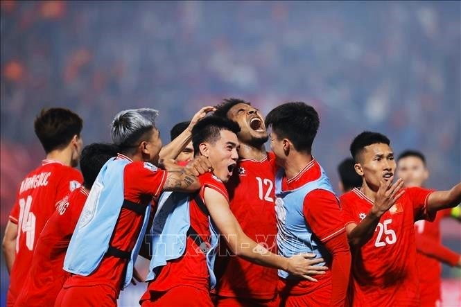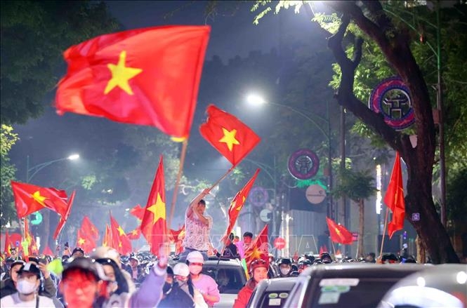Hàng nghìn cổ động viên tại Phú Thọ đổ ra đường mừng chiến thắng của tuyển Việt Nam trước Thái Lan ở trận chung kết lượt đi ASIAN Cup 2024. Ảnh: TTXVN