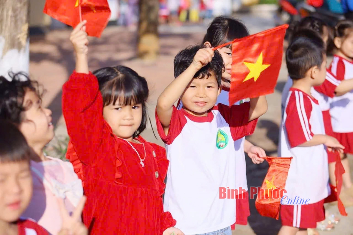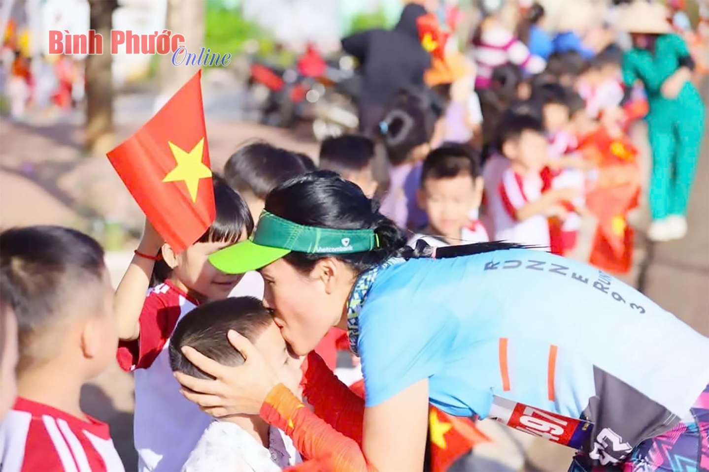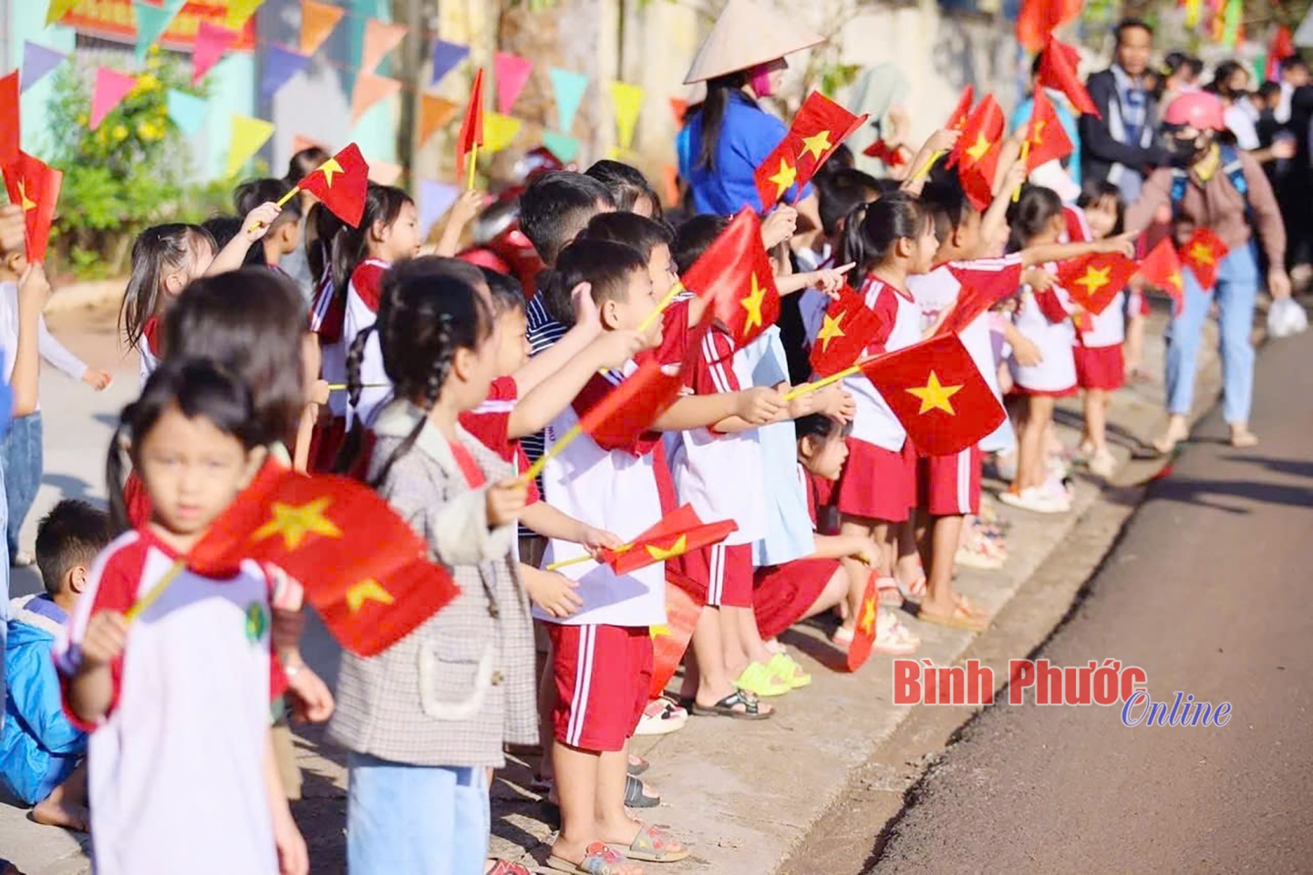 Các em học sinh mầm non cũng ra cổ vũ vận động viên trên đường đua