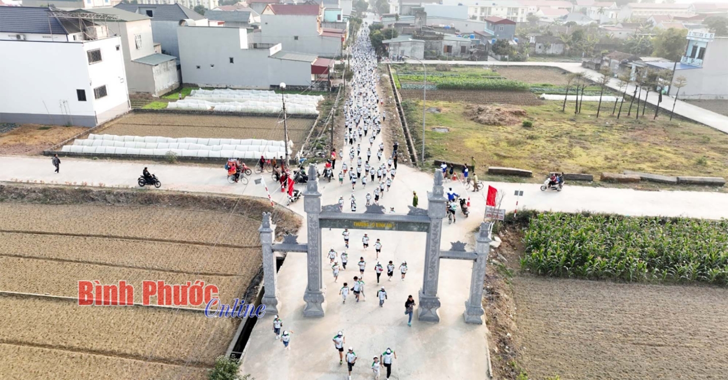 Các vận động viên chạy qua cổng làng Kiến Long