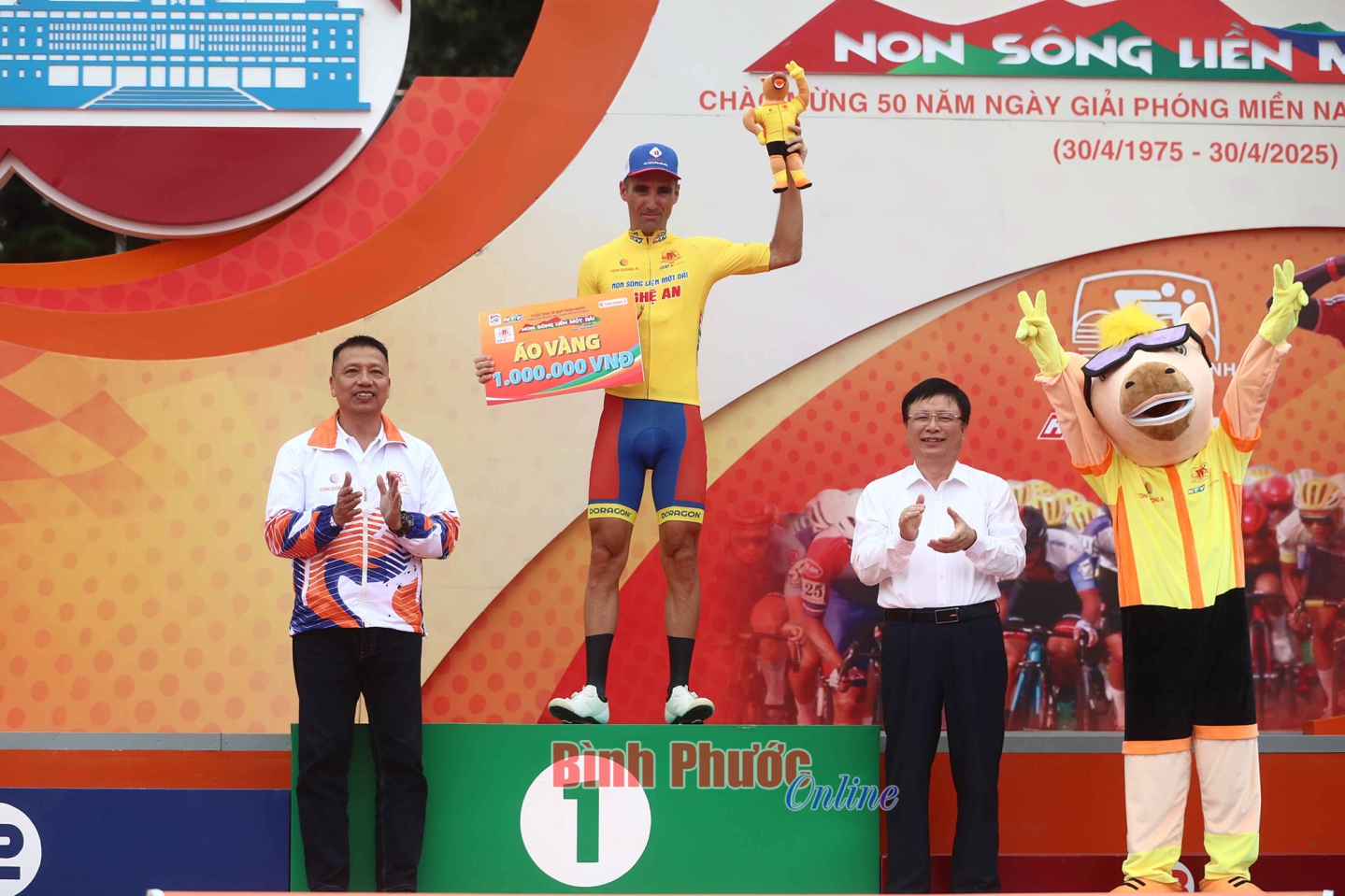 Ông Thái Thành Chung, Phó Tổng giám đốc HTV trao áo vàng cho tay đua Loic Desriac (DDT)