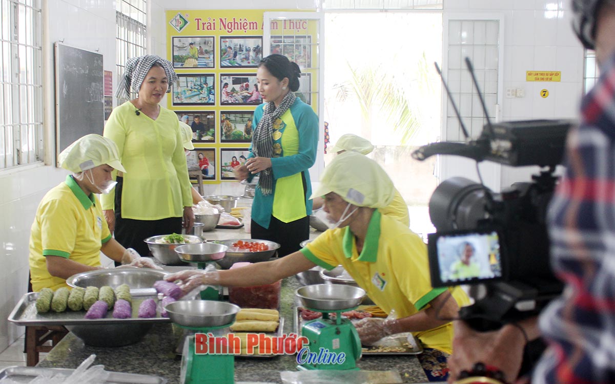 Bà Hai Lý (áo vàng đứng), chủ cơ sở bánh tét Hai Lý đang chia sẻ cách làm ra chiếc bánh ngon với MC Minh Nhật