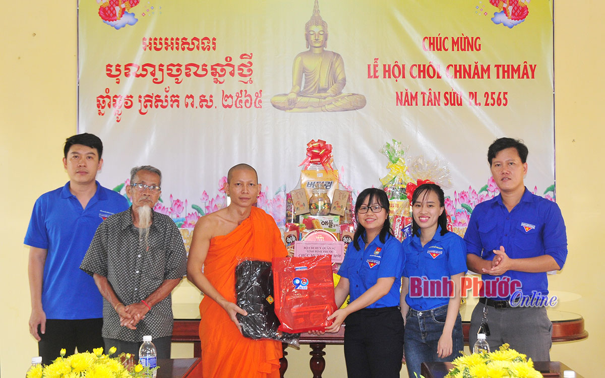 BPO - Nhân dịp Tết cổ truyền Chôl Chnăm Thmây của đồng bào Khmer, chiều nay 14-4, lãnh đạo Tỉnh đoàn Bình Phước do Phó bí thư Tỉnh đoàn, Chủ tịch Hội Liên hiệp thanh niên Việt Nam tỉnh Trần Hoàng Trực làm trưởng đoàn, đã đến thăm và tặng quà chùa Sreyvonsa, phường Tân Xuân, thành phố Đồng Xoài.