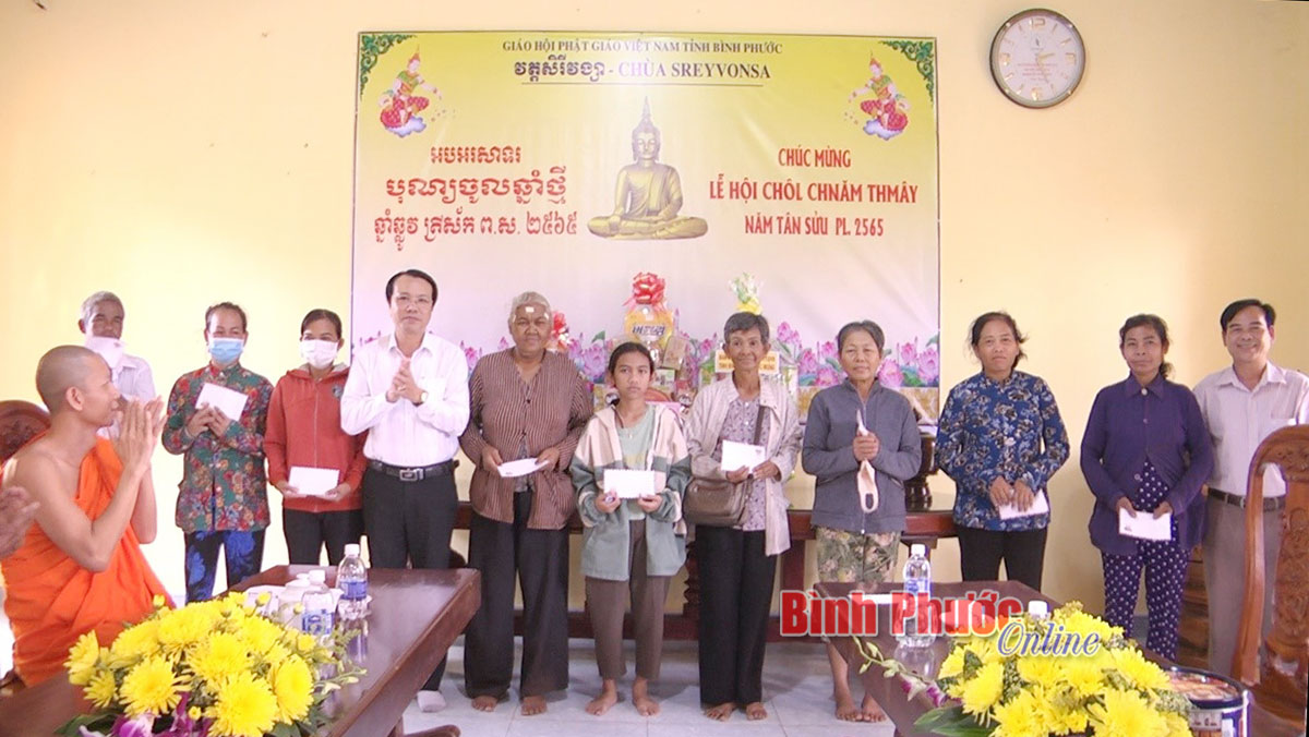 Nhân dịp Tết Chôl Chnăm Thmây năm nay, UBND thành phố Đồng Xoài đã tặng quà cho chùa Sreyvonsa và tặng 10 phần quà tết cho đồng bào Khmer có hoàn cảnh khó khăn trên địa bàn thành phố Đồng Xoài.
