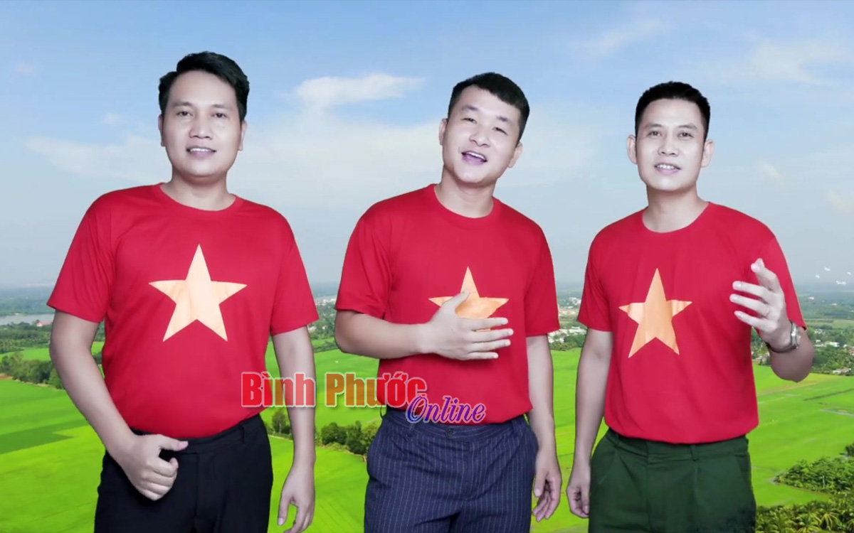 3 ca sĩ thể hiện ca khúc “Việt Nam ơi! Tiếng gọi thiêng liêng” từ trái qua phải là Minh Sơn, Việt Hòa và Duy Thao