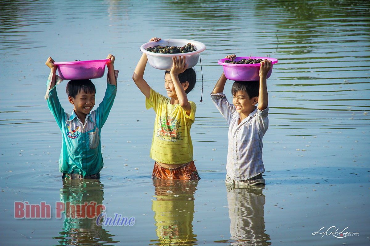 Ba anh em Khánh, Khang, Thành tranh thủ những ngày nghỉ bắt ốc trên những cánh đồng ngập nước ở huyện Vị Thủy, tỉnh Hậu Giang