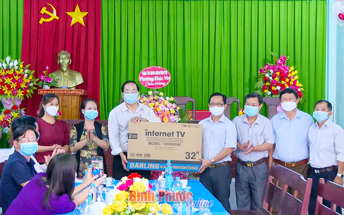 Lãnh đạo Thị ủy Phước Long, Đảng ủy phường Thác Mơ cũng có các phần quà, lẵng hoa chức mừng nhân dân khu phố 4.