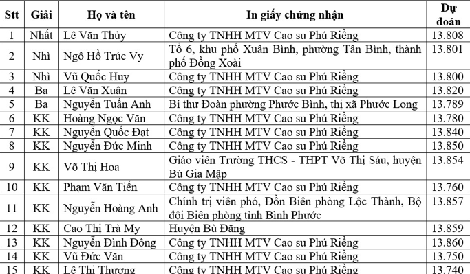 Kết quả, giải Nhất cá nhân thuộc về Lê Văn Thủy, Công ty TNHH MTV Cao su Phú Riềng (số dự đoán 13.808); 2 giải Nhì thuộc về Ngô Hồ Trúc Vy, tổ 6, khu phố Xuân Bình, phường Tân Bình, thành phố Đồng Xoài (số dự đoán 13.801) và Vũ Quốc Huy, Công ty TNHH MTV Cao su Phú Riềng (số dự đoán 13.800).