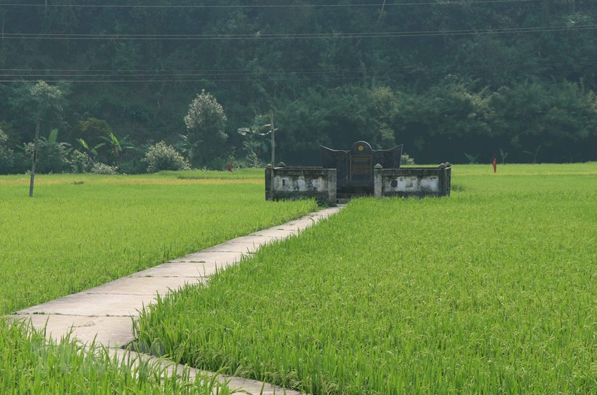 Bia tưởng niệm của di tích Mường Pồn (huyện Điện Biên), nơi anh hùng Bế Văn Đàn lấy thân mình làm giá súng.( Ảnh: Xuân Tiến/TTXVN)