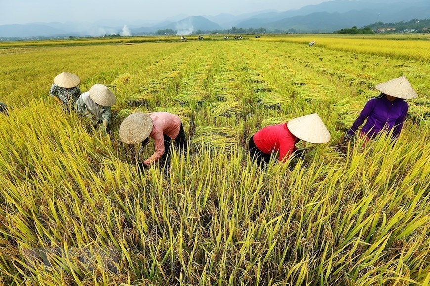 Thu hoạch lúa Hè thu trên cánh đồng Mường Thanh. (Ảnh: Phan Tuấn Anh/TTXVN)