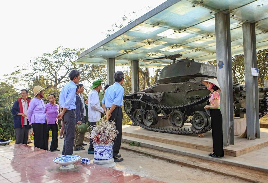 Thuyết minh viên hướng dẫn du khách tham quan tại Di tích Đồi A1, tỉnh Điện Biên. (Ảnh: Xuân Tư/TTXVN)