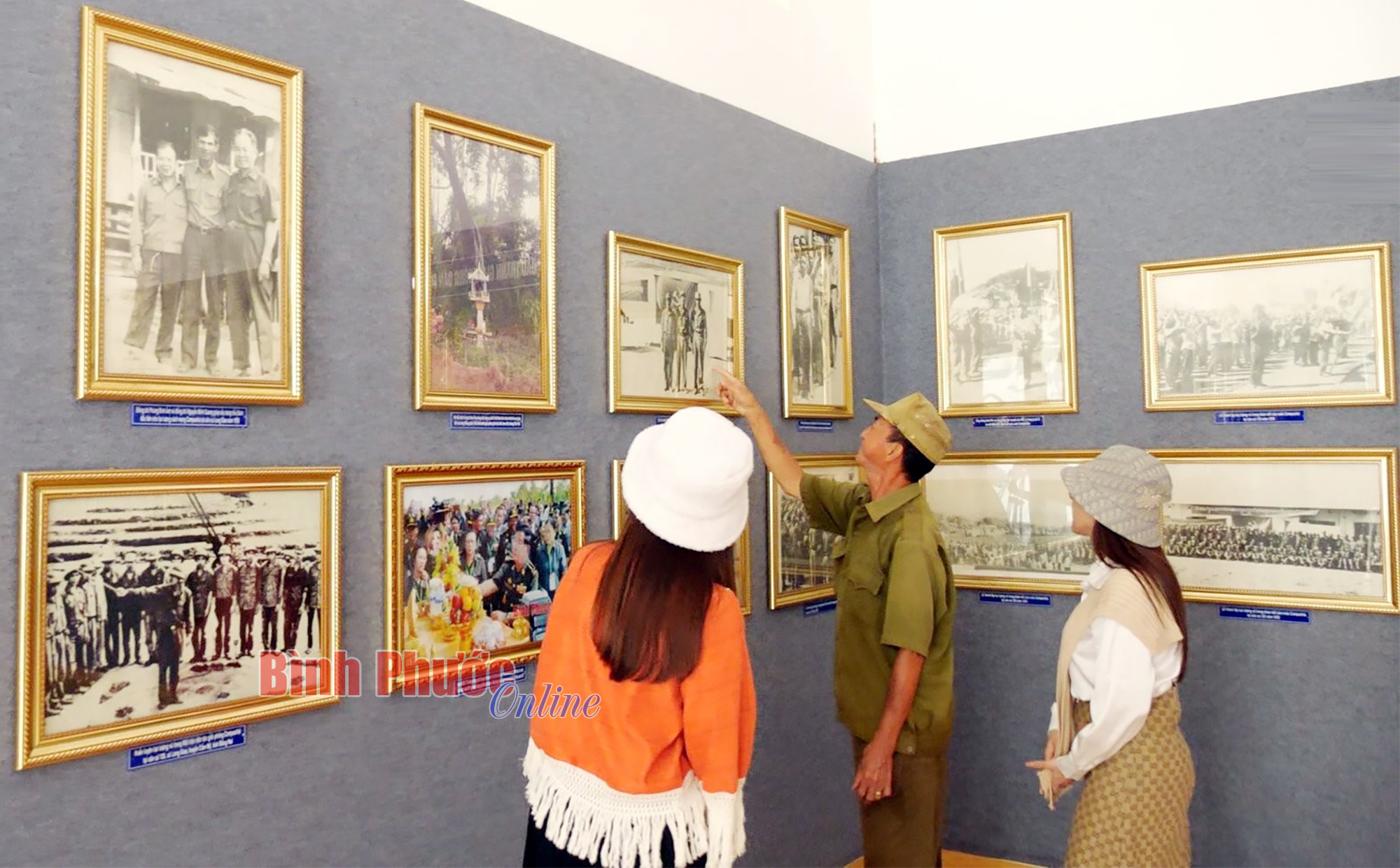 Nhà trưng bày triển lãm hình ảnh, hiện vật liên quan đến hành trình cứu nước của Thủ tướng Hunsen. Trong ảnh: Cựu chiến binh Dương Văn Thân giới thiệu với MC chương trình Hành trình Bình Phước về hình ảnh trong nhà trưng bày