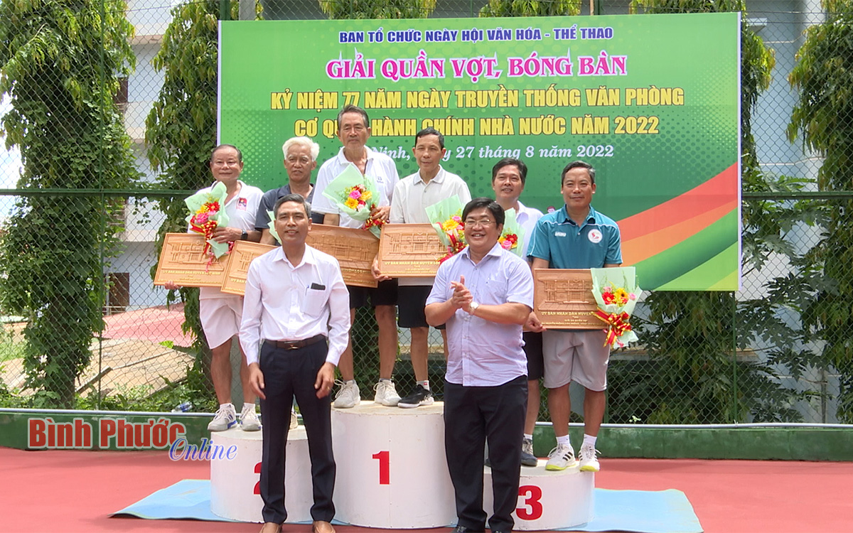Chánh văn phòng UBND tỉnh Phạm Văn Trinh và Phó chủ tịch UBND huyện Lộc Ninh Nguyễn Thanh Phi trao giải quần vợt hệ lãnh đạo