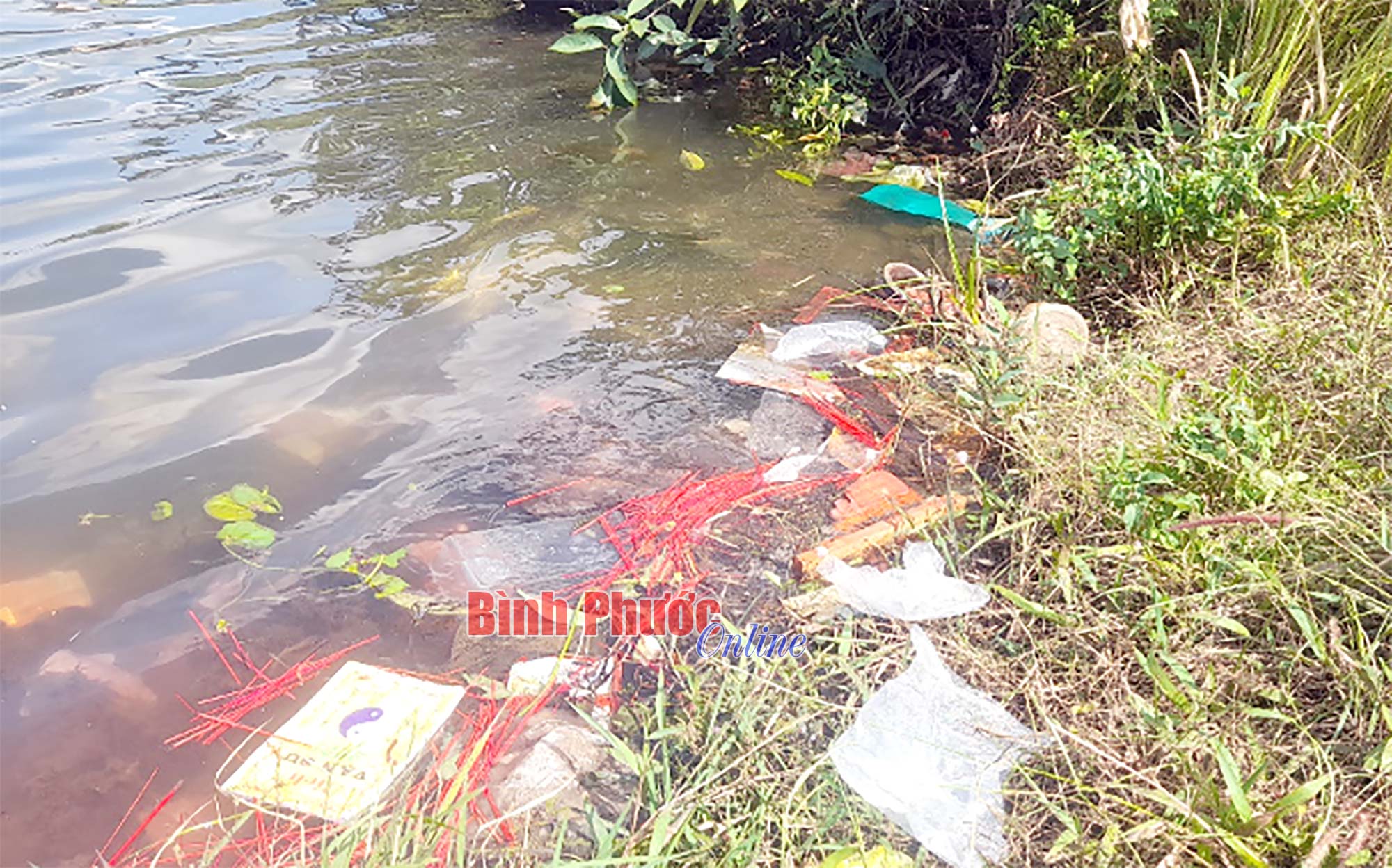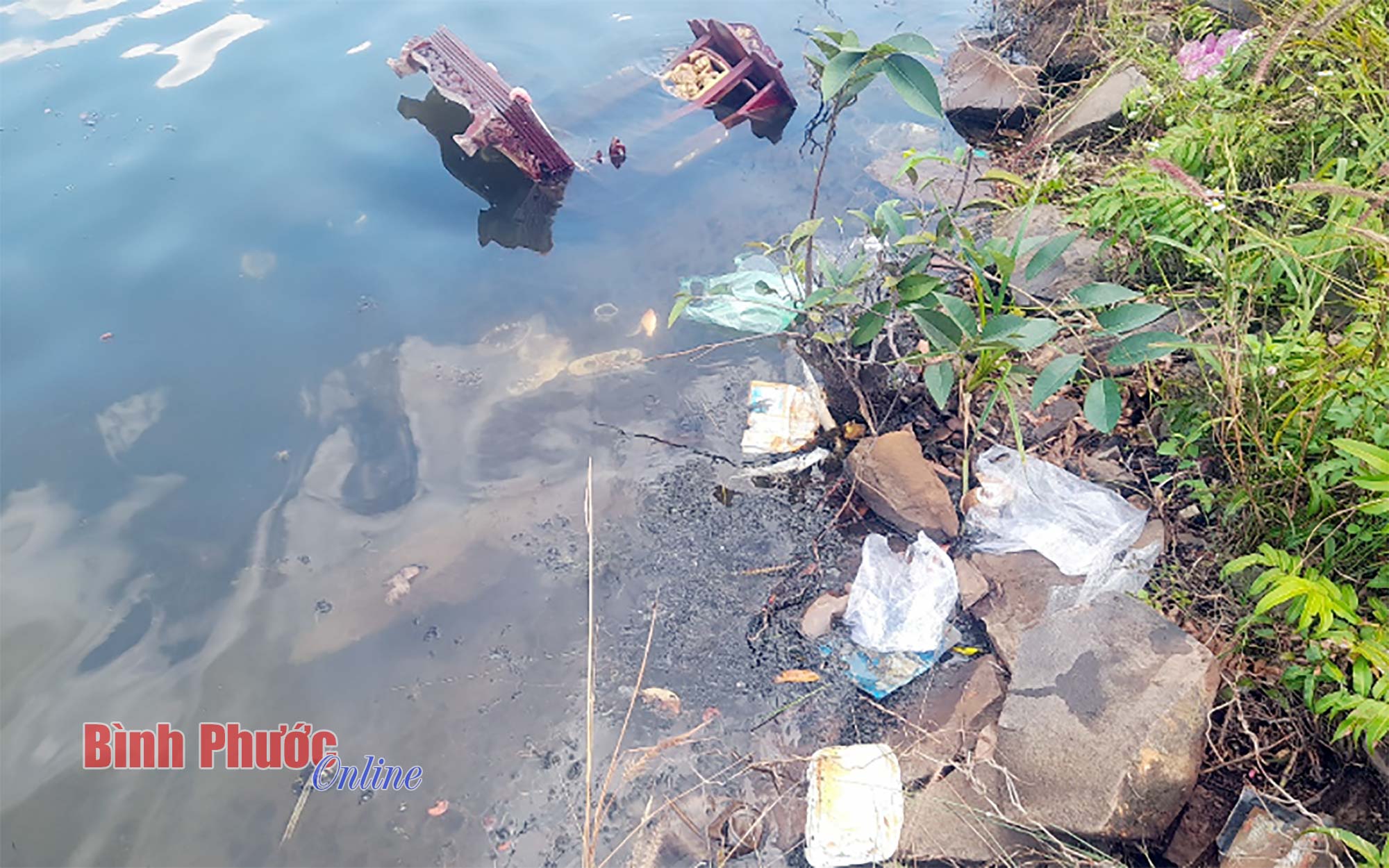 Đập Bà Mụ, thị trấn Tân Phú, huyện Đồng Phú là nơi cung cấp nước sạch cho hầu hết người dân trên địa bàn. Đây cũng là nơi được UBND huyện Đồng Phú lấy làm điểm nhấn trung tâm trong quy hoạch khu đô thị sinh thái của huyện trong tương lai. Tuy nhiên khoảng 13 giờ hôm nay, theo quan sát của chúng tôi, người dân không chỉ thả cá mà còn thả cả… bát nhang, chân nhang, bàn thờ, hoa và đặc biệt là túi ni-lon xuống lòng hồ.