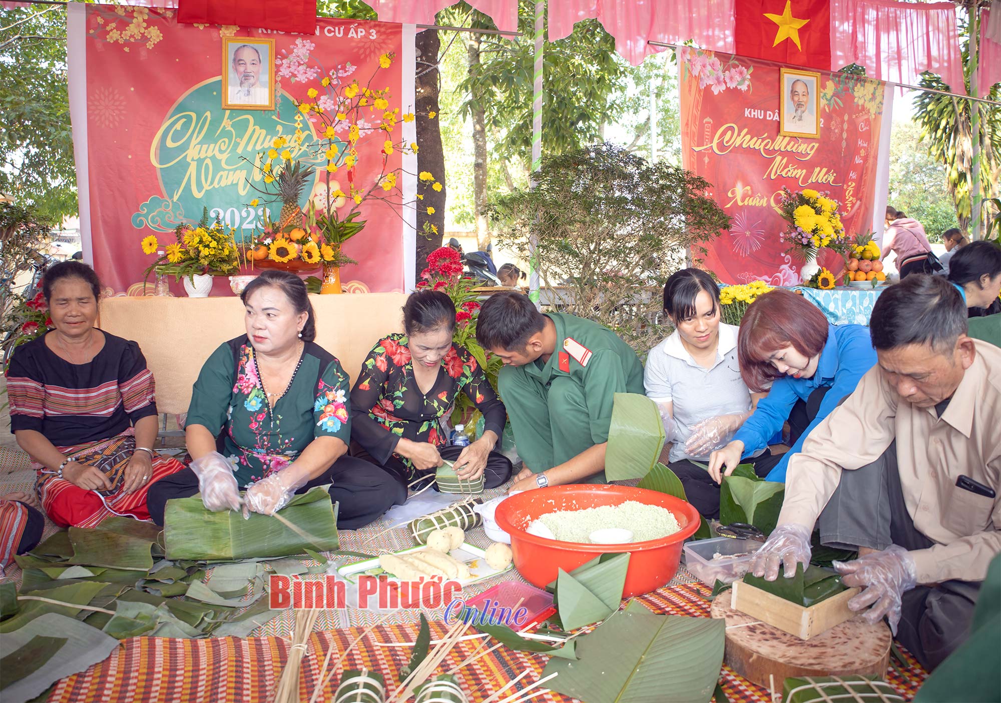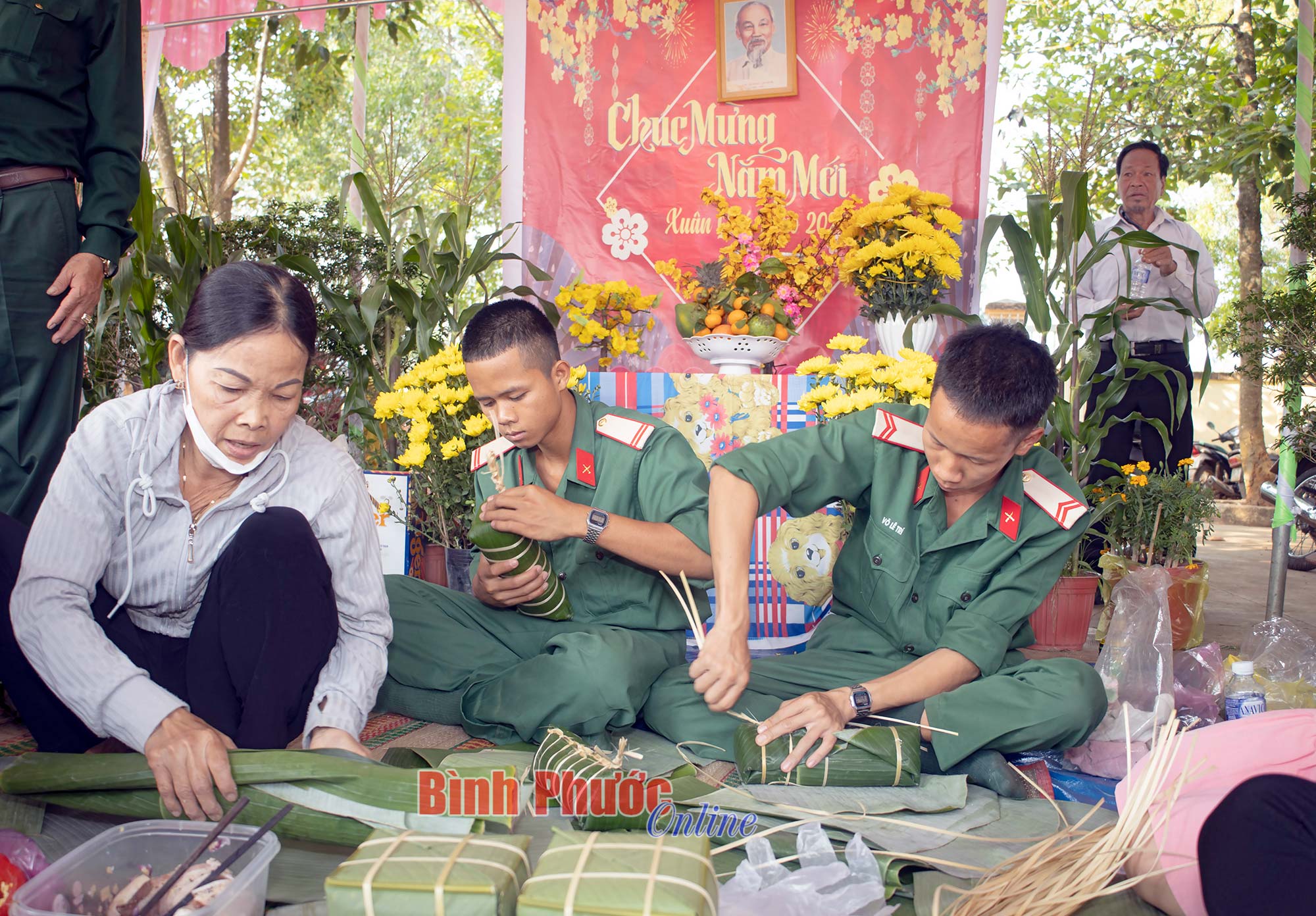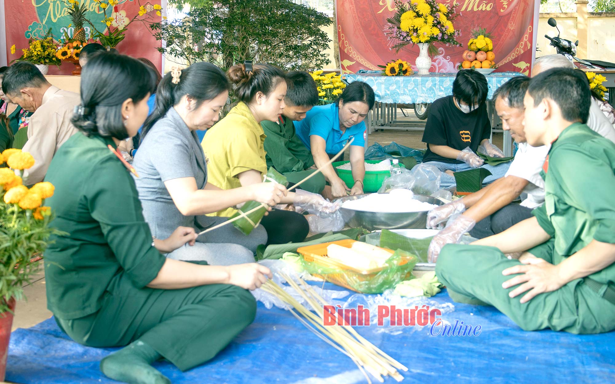 Hoạt động gói bánh chưng, bánh tét tại chương trình “Tết quân - dân” ở huyện Hớn Quản thu hút sự tham gia của đông đảo người dân, cán bộ và lực lượng vũ trang