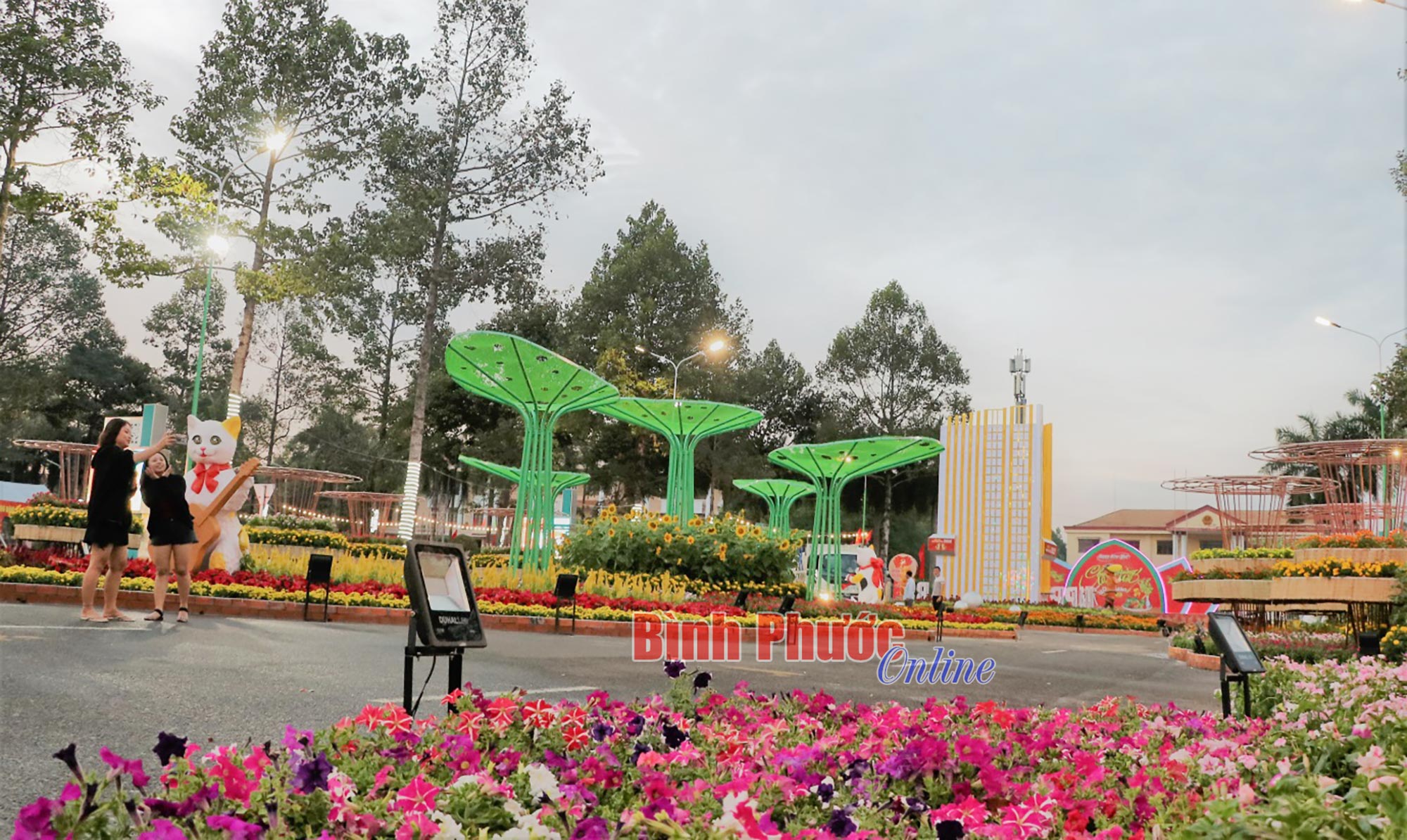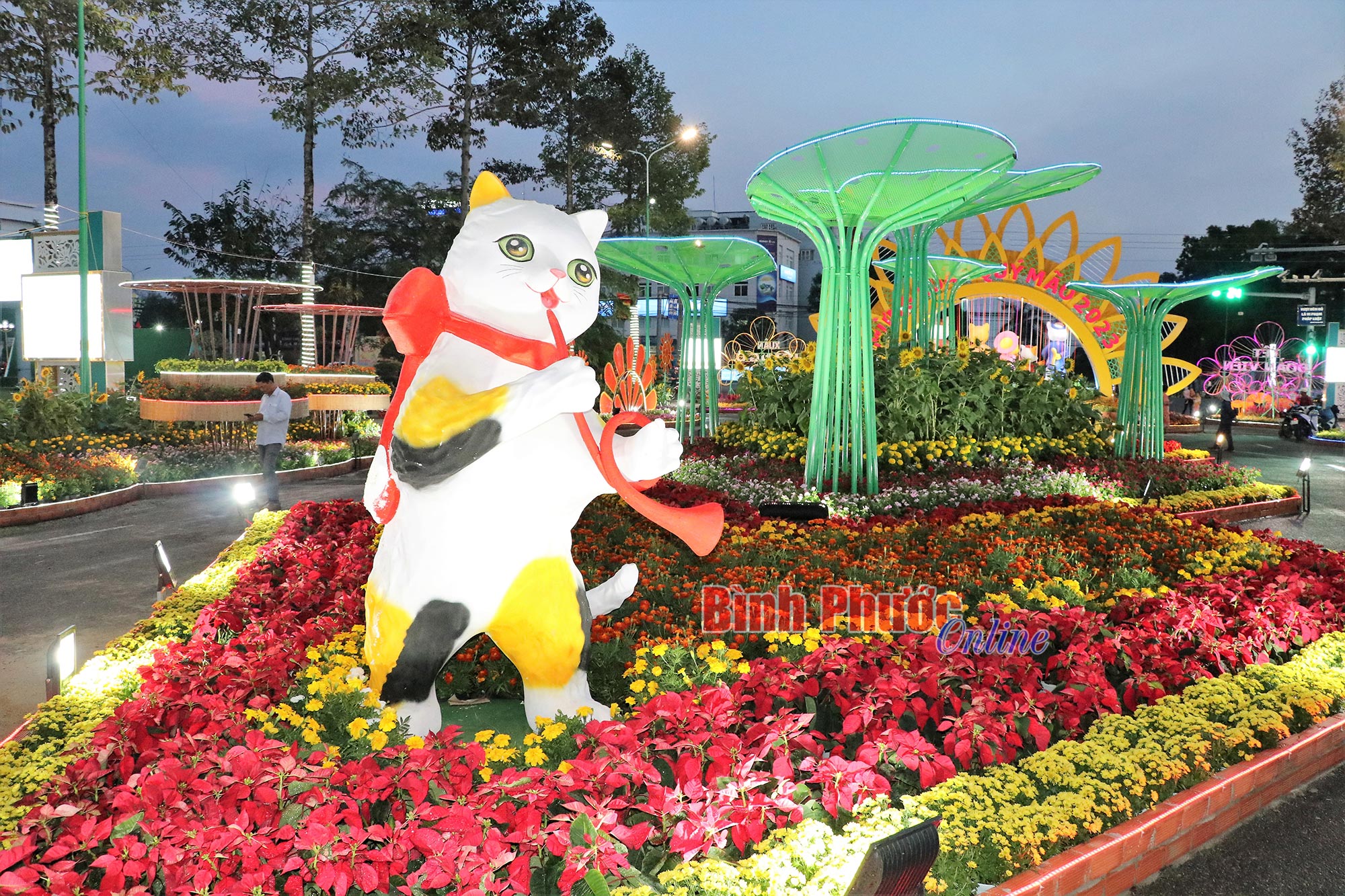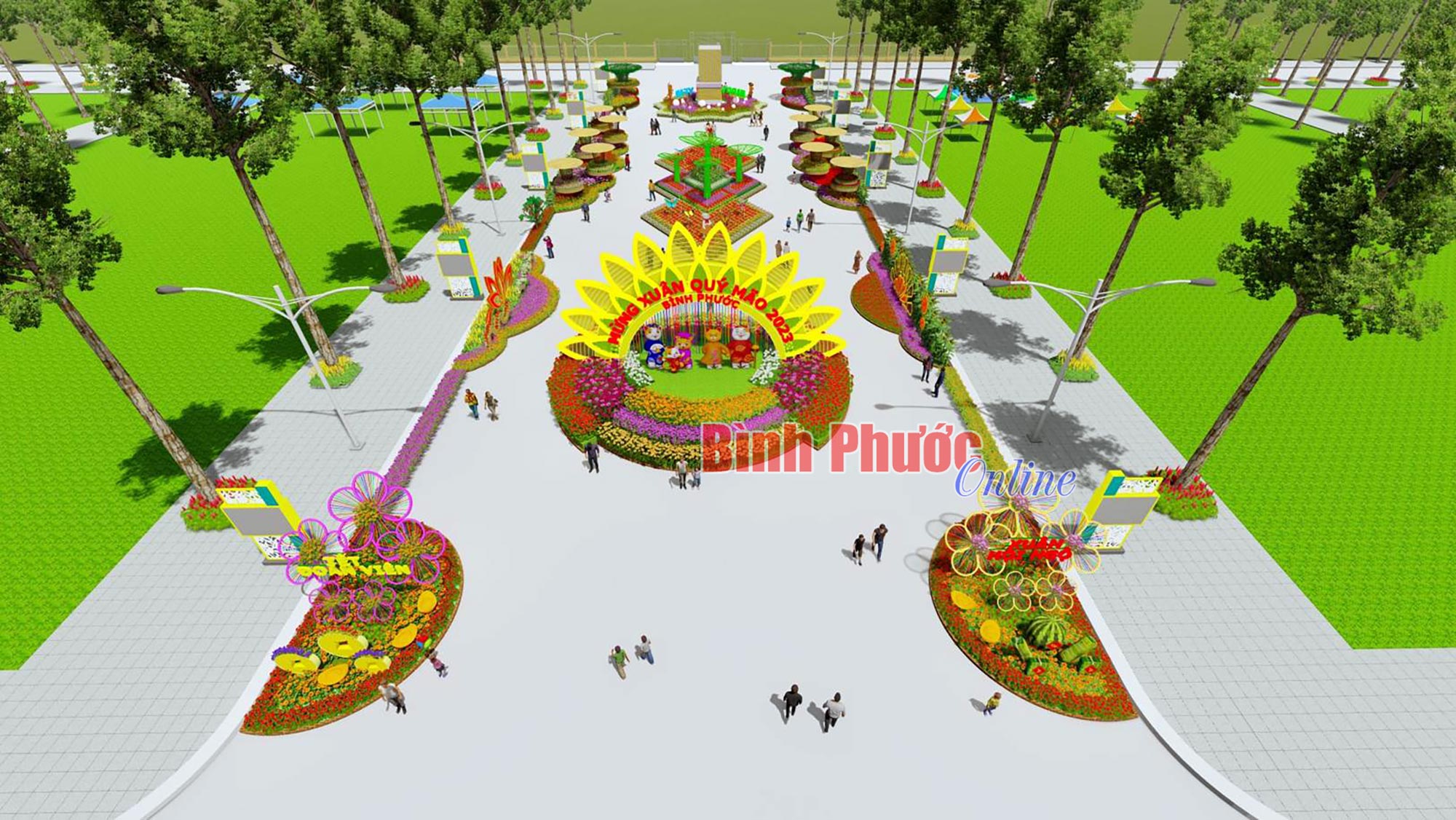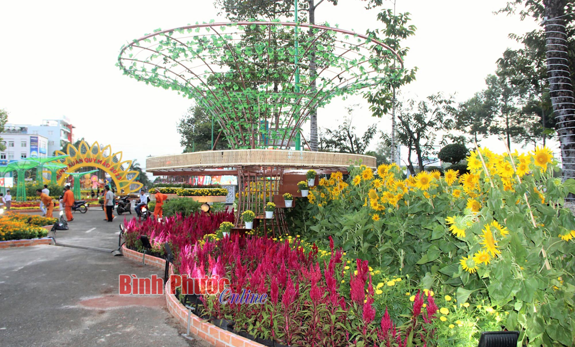 Để tạo không gian mới mẻ cho người dân và du khách tham quan, chụp ảnh, đường hoa năm nay được bày trí hài hòa gồm 3 phần: Xuân hiện đại - hội tụ thể hiện ở phần cổng chào với ý nghĩa tết sung túc, giàu sang phú quý và sức khỏe cùng với tạo hình linh vật là gia đình mèo; Xuân sinh thái - nghĩa tình (giữa trung tâm) gồm các mầm cây đâm chồi nảy lộc và các chú mèo đang thổi khúc nhạc mùa xuân. Tất cả mang một sức sống tươi mới và đầy màu sắc, thể hiện cảnh quan sinh thái thiên nhiên và con người của tỉnh Bình Phước nói chung và của thành phố Đồng Xoài nói riêng; Xuân khát vọng với ý tưởng thiết kế mô phỏng hình ảnh trung tâm là tòa nhà cao tầng hiện đại. Đây là điểm nổi bật của đường hoa chuyển tải thông điệp xanh, thông minh, sự chuyển động, hòa quyện với nhau giữa ánh sáng nghệ thuật trên nền công nghệ 4.0.