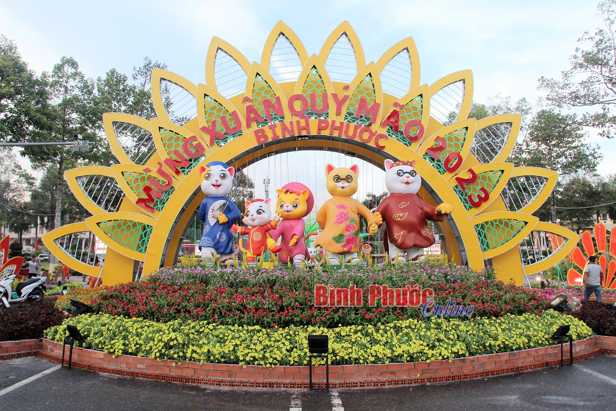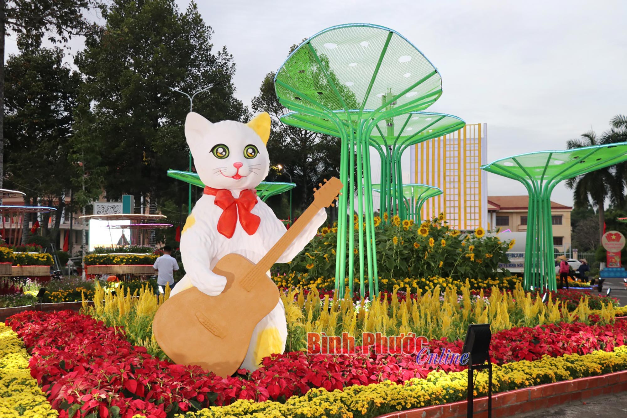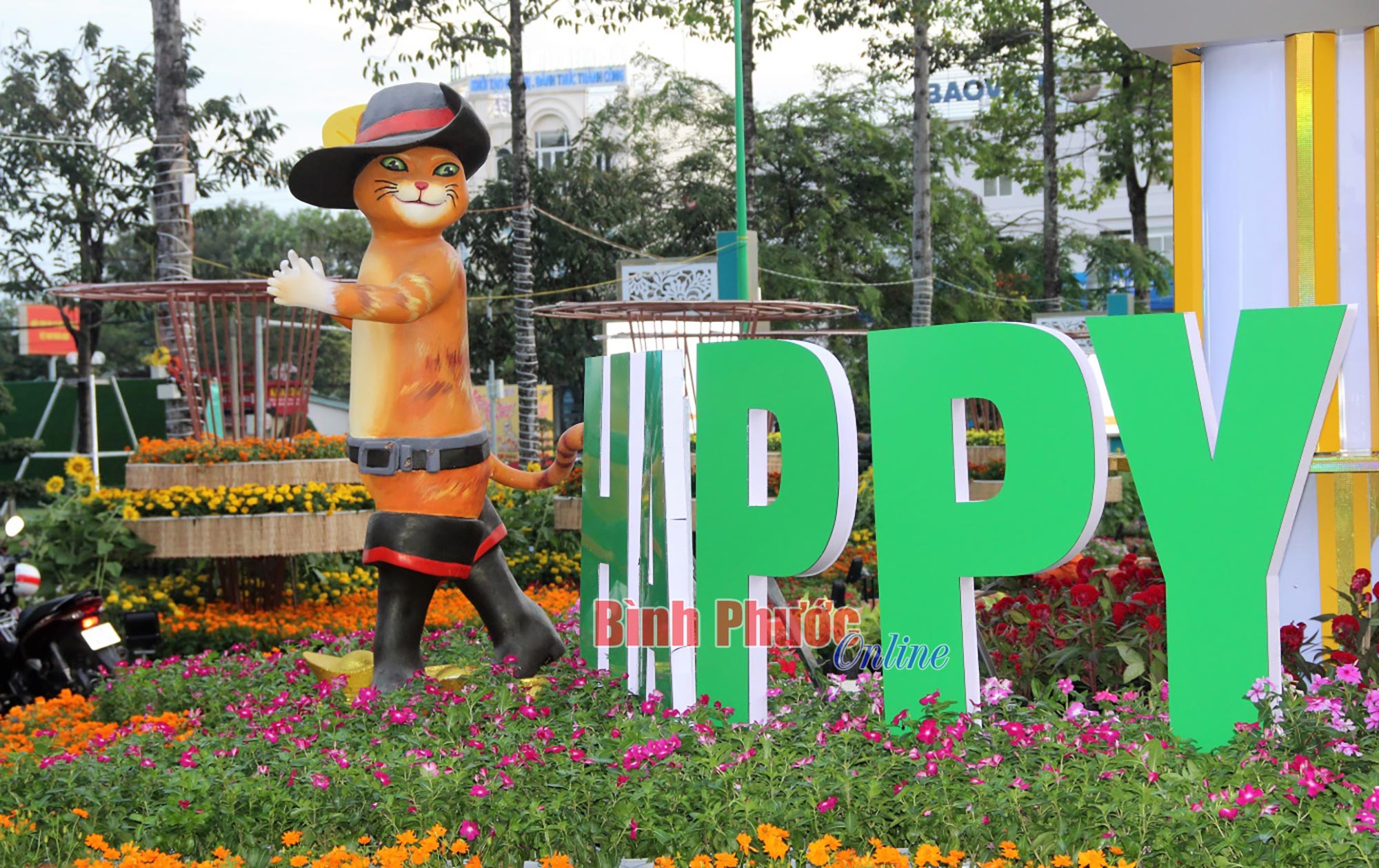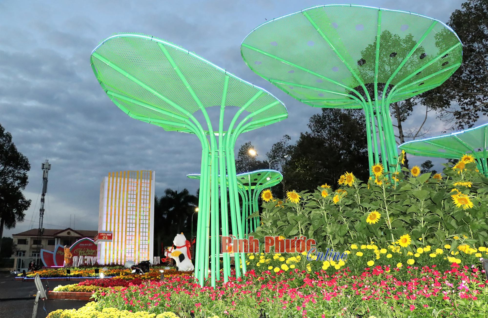 Để tạo không gian mới mẻ cho người dân và du khách tham quan, chụp ảnh, đường hoa năm nay được bày trí hài hòa gồm 3 phần: Xuân hiện đại - hội tụ thể hiện ở phần cổng chào với ý nghĩa tết sung túc, giàu sang phú quý và sức khỏe cùng với tạo hình linh vật là gia đình mèo; Xuân sinh thái - nghĩa tình (giữa trung tâm) gồm các mầm cây đâm chồi nảy lộc và các chú mèo đang thổi khúc nhạc mùa xuân. Tất cả mang một sức sống tươi mới và đầy màu sắc, thể hiện cảnh quan sinh thái thiên nhiên và con người của tỉnh Bình Phước nói chung và của thành phố Đồng Xoài nói riêng; Xuân khát vọng với ý tưởng thiết kế mô phỏng hình ảnh trung tâm là tòa nhà cao tầng hiện đại. Đây là điểm nổi bật của đường hoa chuyển tải thông điệp xanh, thông minh, sự chuyển động, hòa quyện với nhau giữa ánh sáng nghệ thuật trên nền công nghệ 4.0.