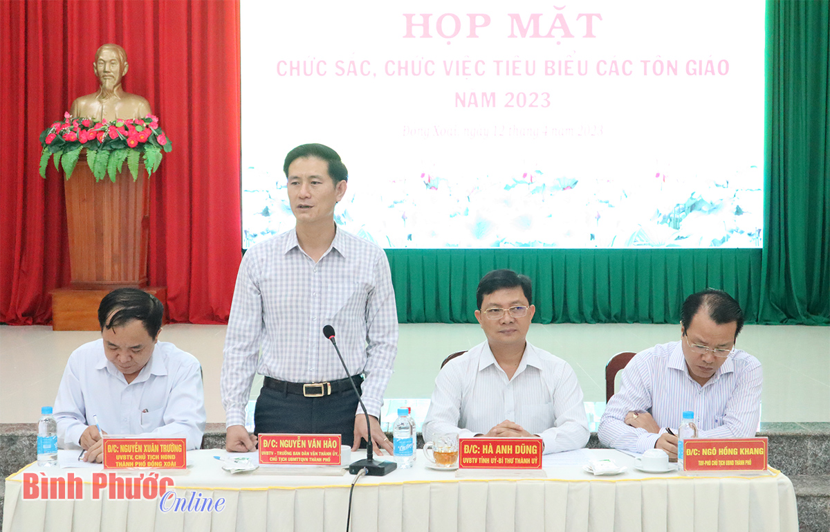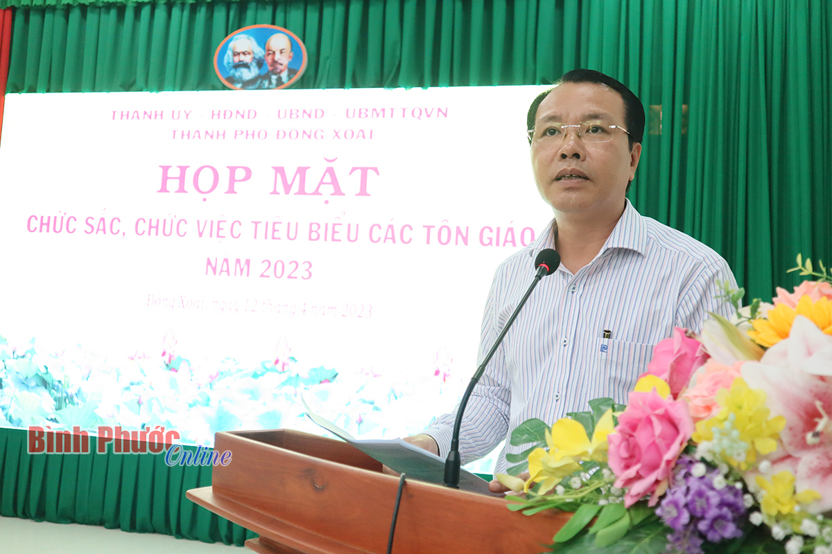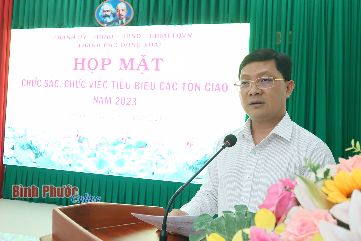 Phát biểu tại buổi họp mặt, Ủy viên Ban Thường vụ Tỉnh ủy, Bí thư Thành ủy Đồng Xoài Hà Anh Dũng cảm ơn và ghi nhận những góp ý chân tình của các chức sắc, chức việc trong xây dựng thành phố sạch, đẹp, văn minh, hiện đại. Cấp ủy, chính quyền thành phố Đồng Xoài luôn thực hiện có hiệu quả chủ trương, chính sách đối với các tôn giáo; tạo điều kiện hỗ trợ về mọi mặt để các tôn giáo sinh hoạt, tín ngưỡng theo đúng quy định.