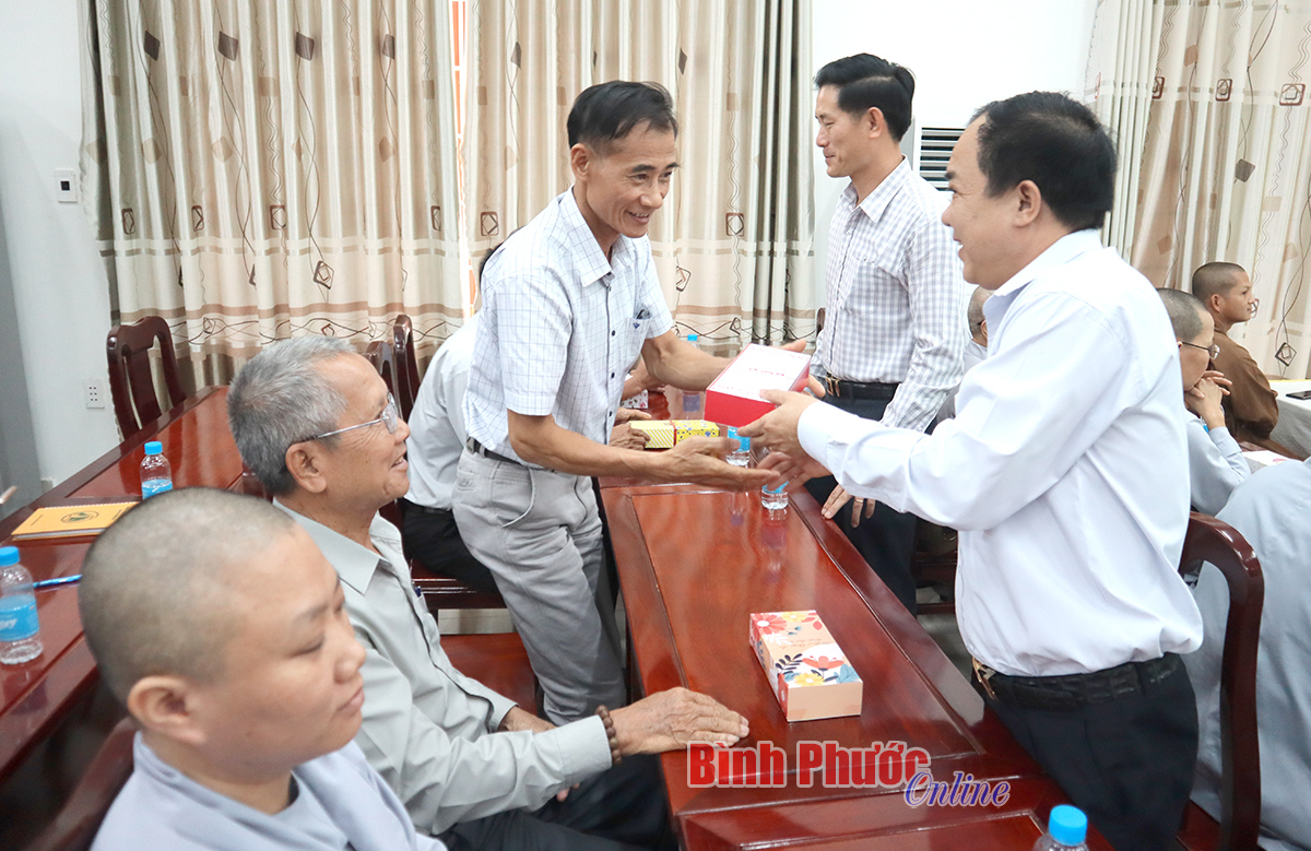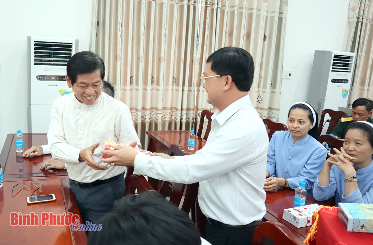 Ủy viên Ban Thường vụ Tỉnh ủy, Bí thư Thành ủy Đồng Xoài Hà Anh Dũng tặng quà cho các chức sắc, chức việc
