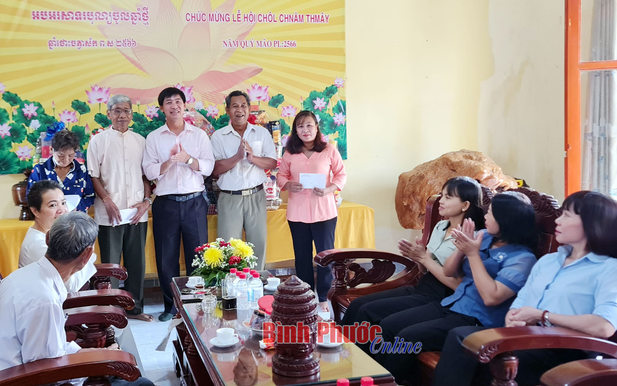 Dịp này, Ban Dân tộc tỉnh tặng 1 phần quà trị giá 3 triệu đồng cho chùa Sreyvonsa và 6 phần quà, mỗi phần trị giá 500 ngàn đồng cho các hộ cận nghèo đồng bào Khmer, người có uy tín và già làng tiêu biểu trên địa bàn thành phố Đồng Xoài.