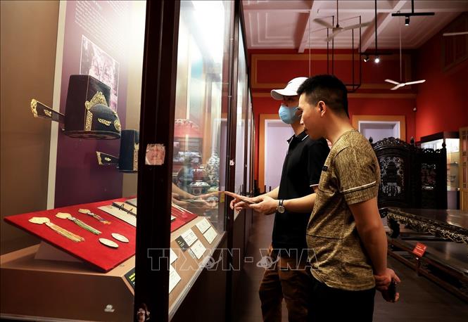 Du khách tìm hiểu các hiện vật cung đình thời nhà Nguyễn (1802-1945). Ảnh: Hồng Đạt/TTXVN