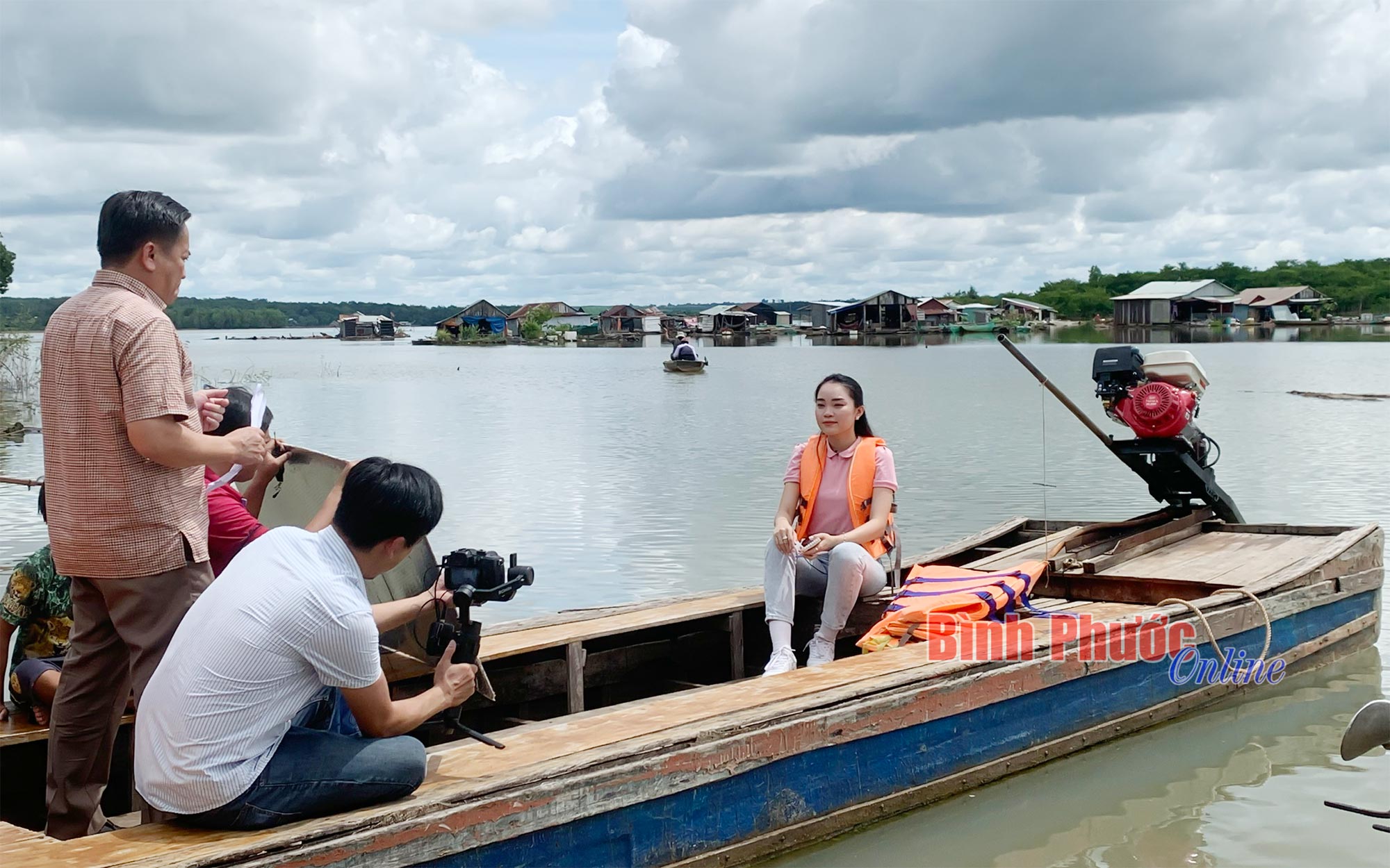 Ê-kíp cán bộ, phóng viên, MC của BPTV ghi hình tại làng bè xã Phước Minh, huyện Bù Gia Mập để giới thiệu về vẻ đẹp sông nước và cuộc sống của người dân nơi đây