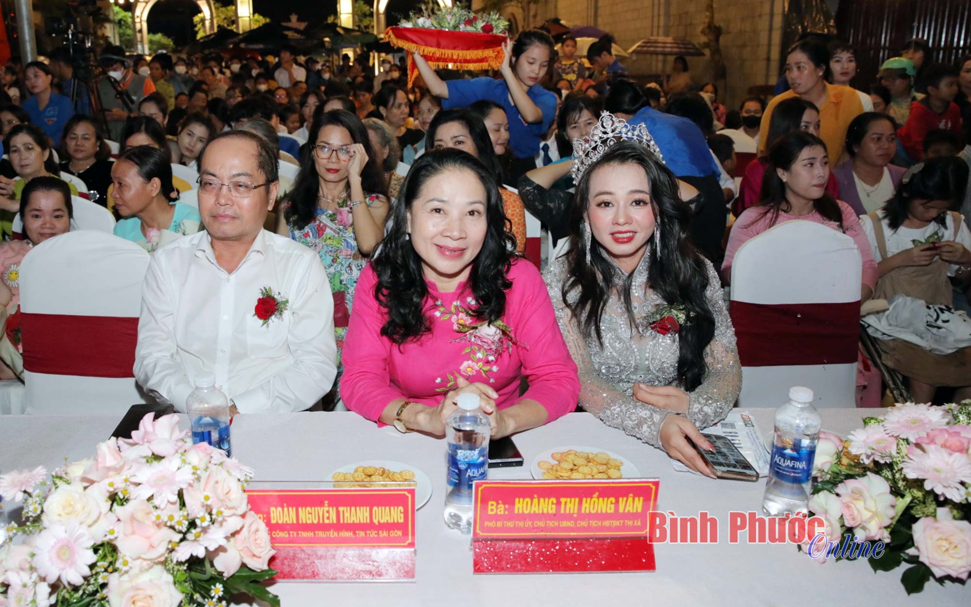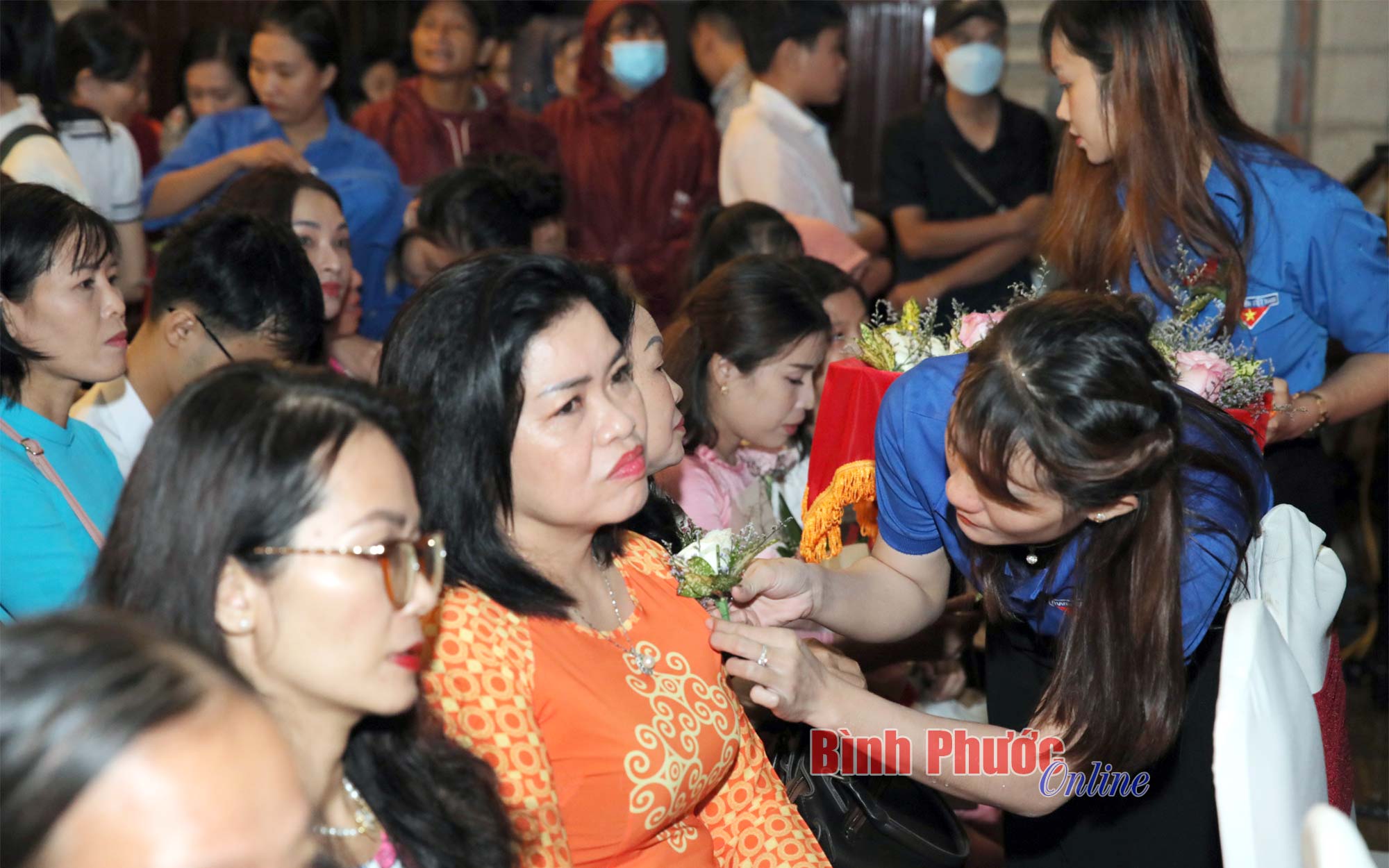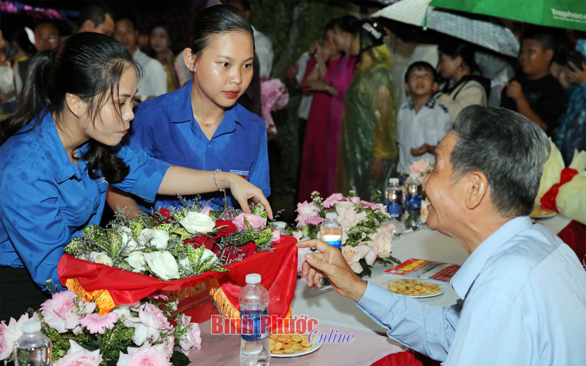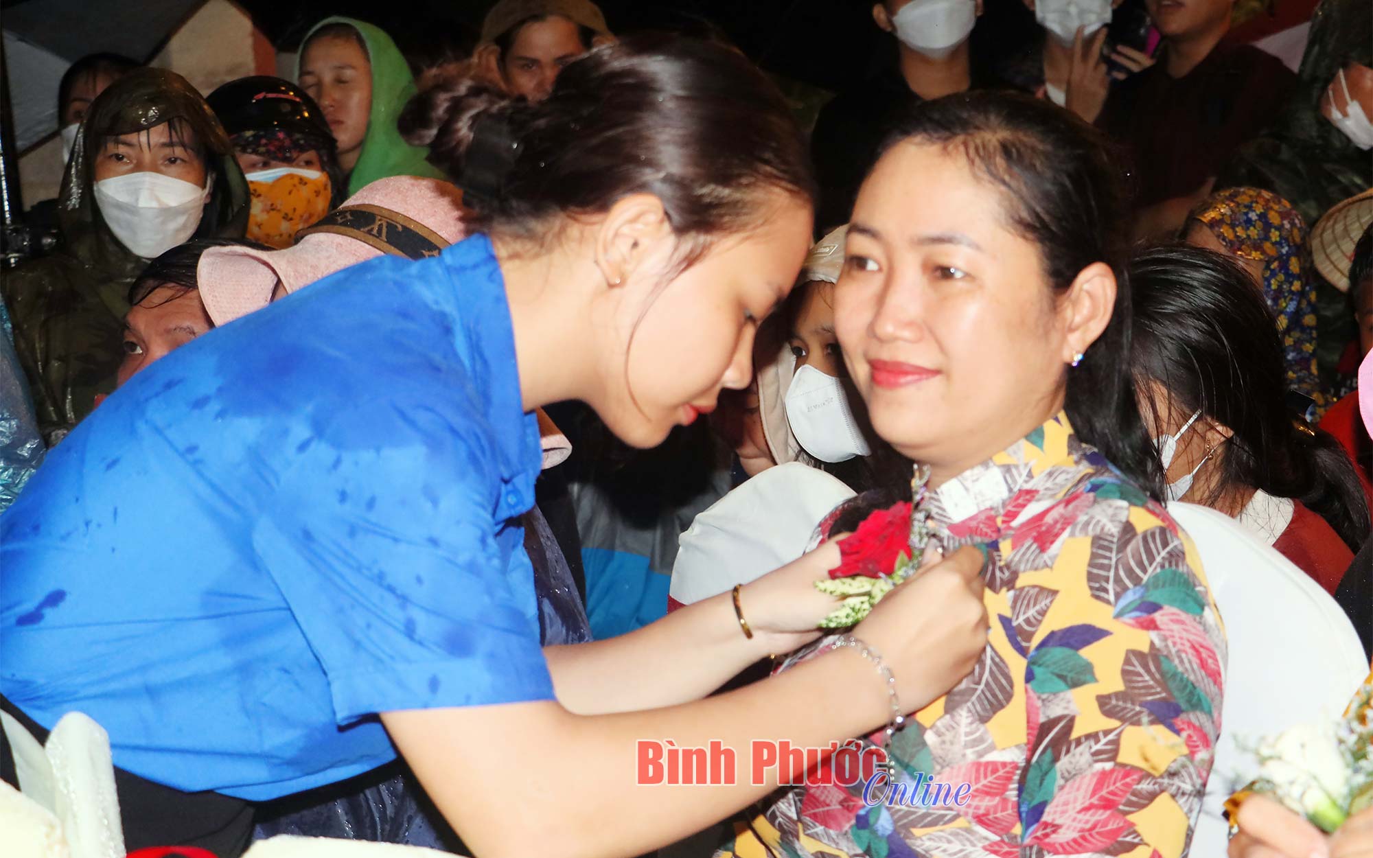 Tình nguyện viên cài hoa lên áo Phó Bí thư Thường trực Tỉnh ủy, Chủ tịch HĐND tỉnh Huỳnh Thị Hằng trong nghi thức "bông hồng cài áo"