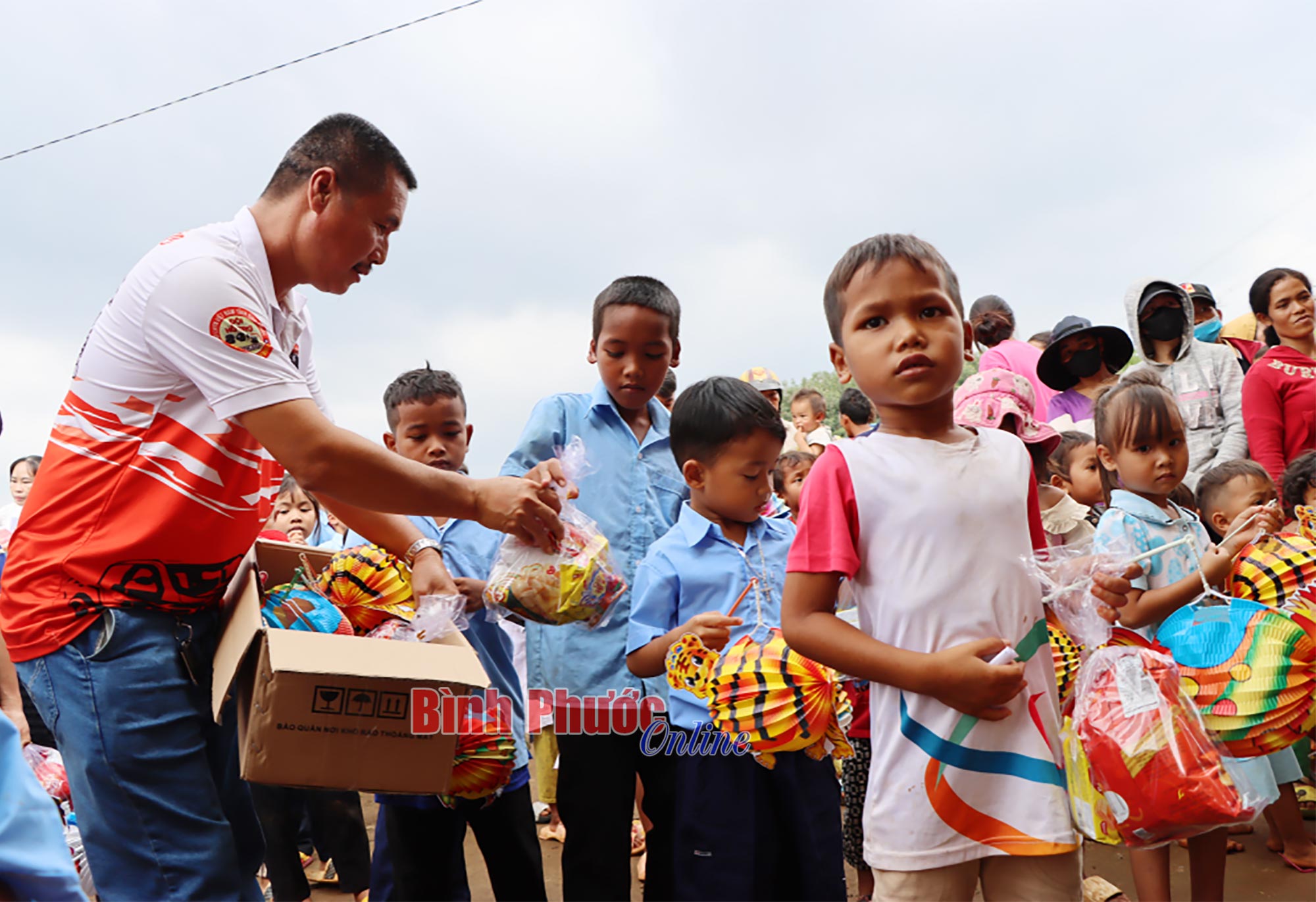 Đại diện Câu lạc bộ Pickup Bình Phước trao tặng lồng đèn, bánh kẹo cho các em thiếu nhi