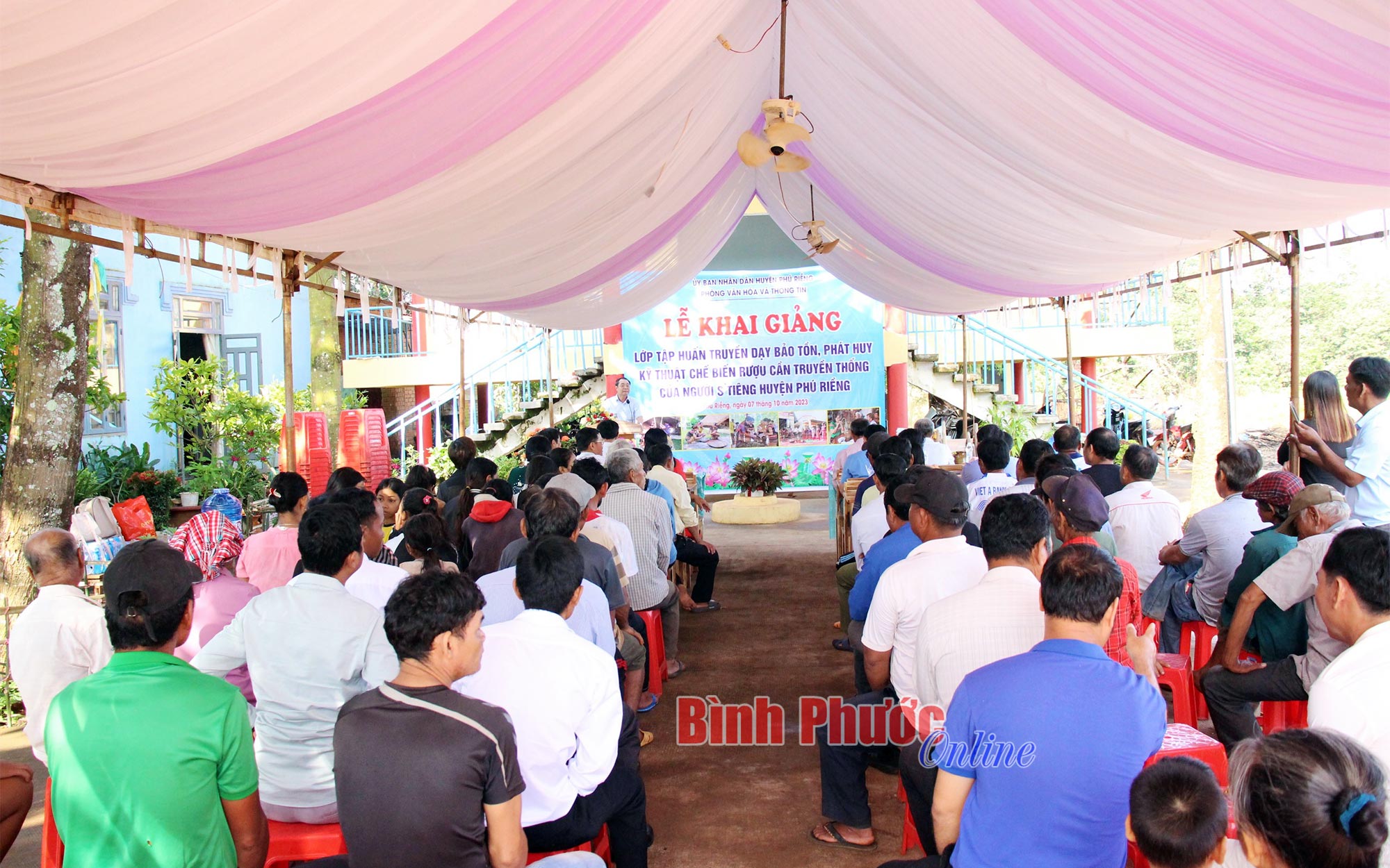 Trong 5 ngày (từ 7 đến 11-10), 94 học viên là người đồng bào dân tộc S’tiêng tại các xã trên địa bàn huyện Phú Riềng sẽ được nghe báo cáo viên truyền đạt các chuyên đề về: Tổng quan bản sắc văn hóa, nghề truyền thống của đồng bào dân tộc S’tiêng Phú Riềng; rượu cần trong không gian văn hóa của đồng bào dân tộc S’tiêng, bản sắc cần được phát huy; quy trình, kỹ thuật chế biến rượu cần; các giải pháp bảo tồn và phát huy văn hóa, tuyên truyền, quảng bá sản phẩm; nghề chế biến rượu cần trong chuỗi giá trị cung ứng sản phẩm du lịch tiêu biểu của địa phương và xem phim tư liệu về kỹ thuật chế biến rượu cần.