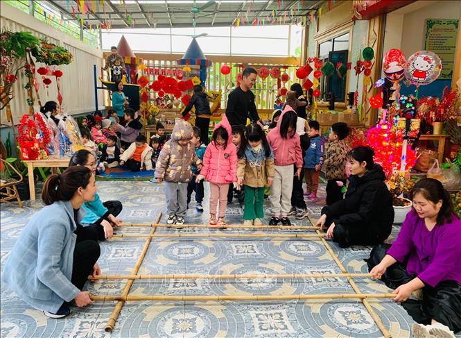 Học sinh Cơ sở Mầm non tư thục Vàng Anh, thành phố Ninh Bình trải nghiệm Phiên chợ Xuân tại do cơ sở tổ chức. Ảnh: TTXVN