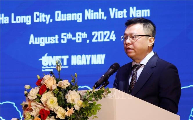 Tổng Biên tập Báo Nhân dân, Phó trưởng Ban Tuyên giáo Trung ương, Chủ tịch Hội Nhà báo Việt Nam Lê Quốc Minh phát biểu tham luận. Ảnh: Văn Đức/TTXVN